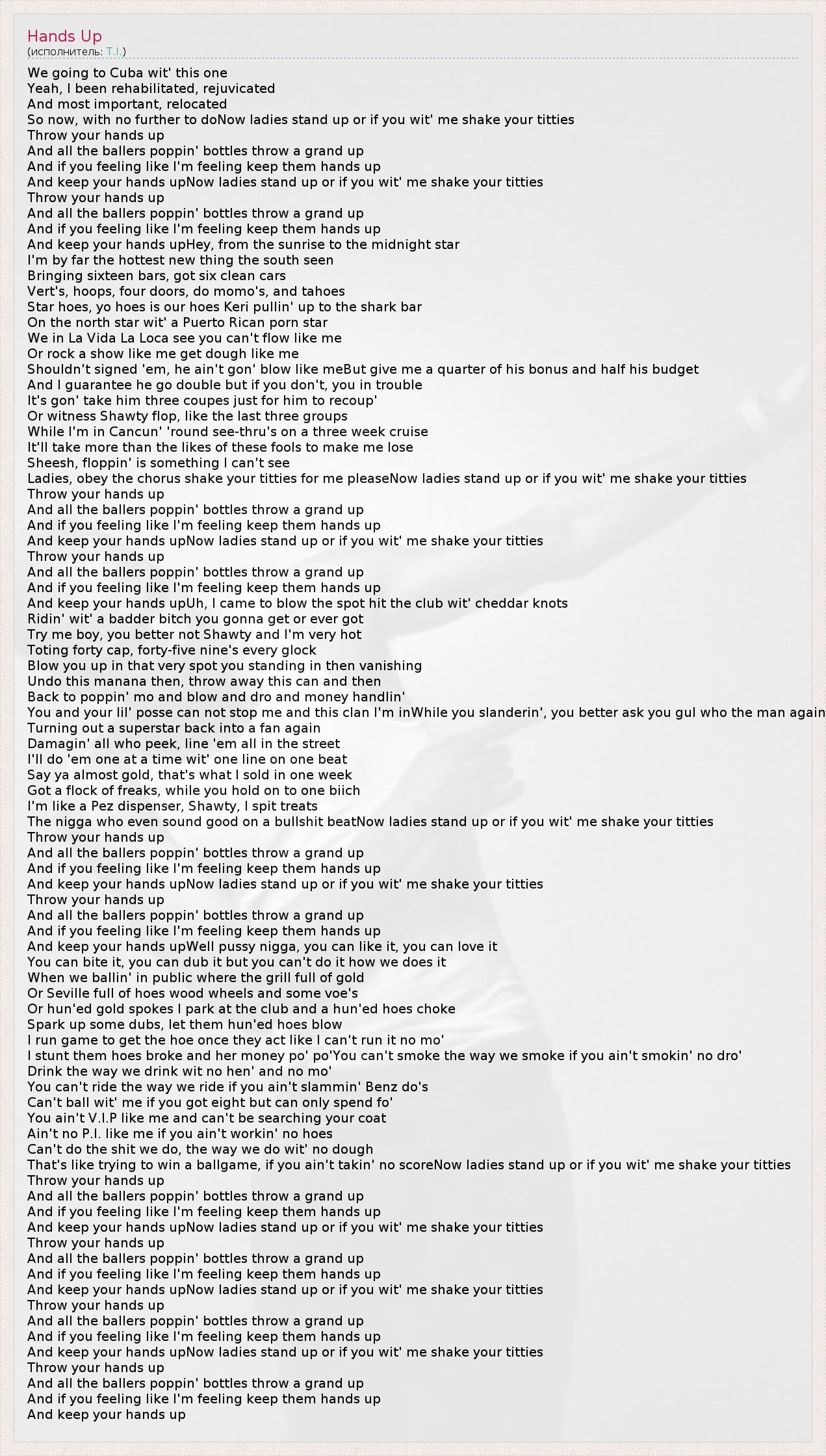 And keep your hands upNow ladies stand up or if you wit' me shake your titties
