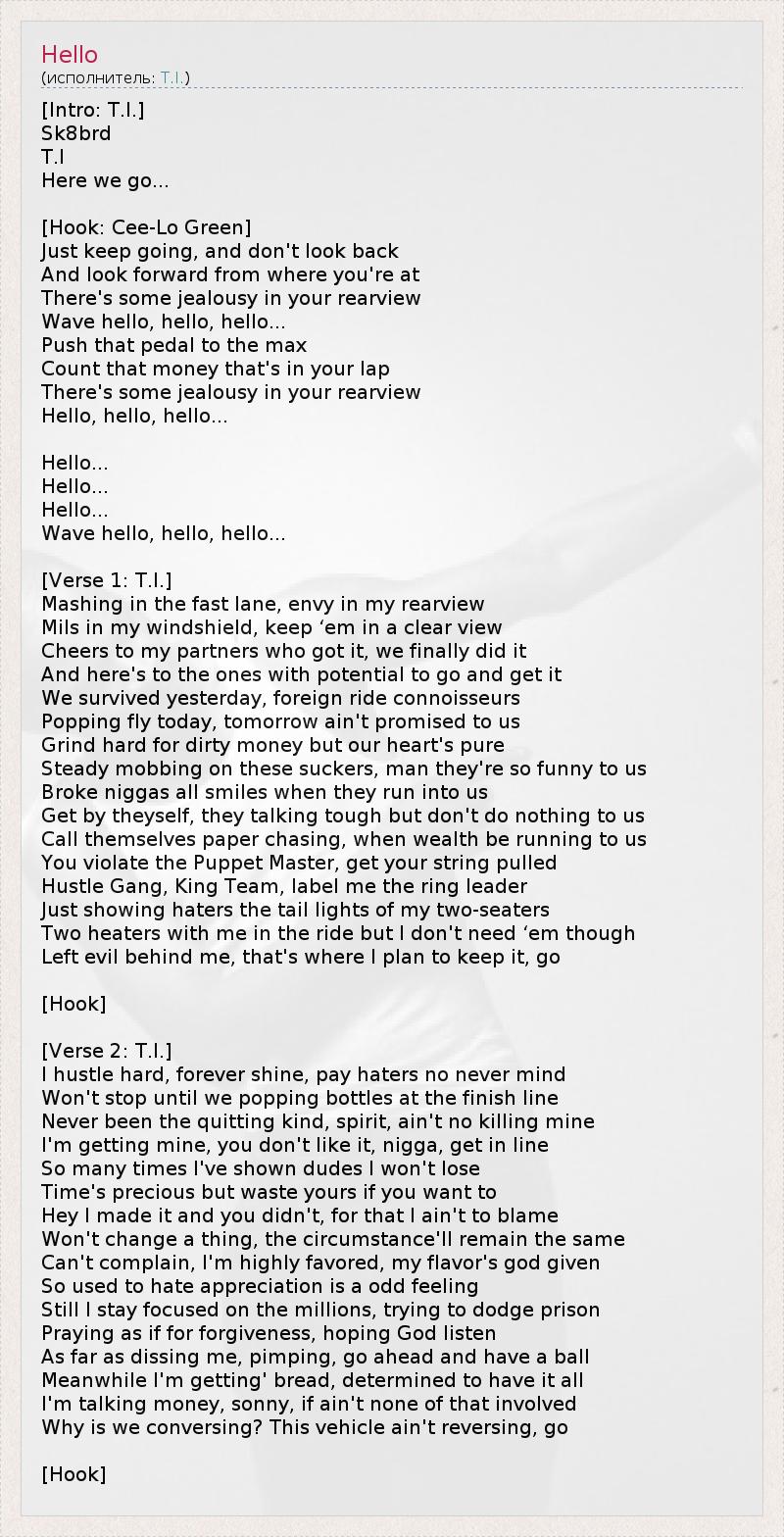 [Intro: T.I.] Sk8brd T.I Here we go... [Hook: Cee-Lo Green] Just keep going, and don't look back And look forward from where you're at There's some jealousy in your rearview Wave hello, hello, hello... Push that pedal to the max Count that money that's in your lap There's some jealousy in your rearview Hello, hello, hello... Hello... Hello... Hello... Wave hello, hello, hello... [Verse 1: T.I.] Mashing in the fast lane, envy in my rearview Mils in my windshield, keep ‘em in a clear view Cheers to my partners who got it, we finally did it And here's to the ones with potential to go and get it We survived yesterday, foreign ride connoisseurs Popping fly today, tomorrow ain't promised to us Grind hard for dirty money but our heart's pure Steady mobbing on these suckers, man they're so funny to us Broke niggas all smiles when they run into us Get by theyself, they talking tough but don't do nothing to us Call themselves paper chasing, when wealth be running to us You violate the Puppet Master, get your string pulled Hustle Gang, King Team, label me the ring leader Just showing haters the tail lights of my two-seaters Two heaters with me in the ride but I don't need ‘em though Left evil behind me, that's where I plan to keep it, go [Hook] [Verse 2: T.I.] I hustle hard, forever shine, pay haters no never mind Won't stop until we popping bottles at the finish line Never been the quitting kind, spirit, ain't no killing mine I'm getting mine, you don't like it, nigga, get in line So many times I've shown dudes I won't lose Time's precious but waste yours if you want to Hey I made it and you didn't, for that I ain't to blame Won't change a thing, the circumstance'll remain the same Can't complain, I'm highly favored, my flavor's god given So used to hate appreciation is a odd feeling Still I stay focused on the millions, trying to dodge prison Praying as if for forgiveness, hoping God listen As far as dissing me, pimping, go ahead and have a ball Meanwhile I'm getting' bread, determined to have it all I'm talking money, sonny, if ain't none of that involved Why is we conversing? This vehicle ain't reversing, go [Hook]