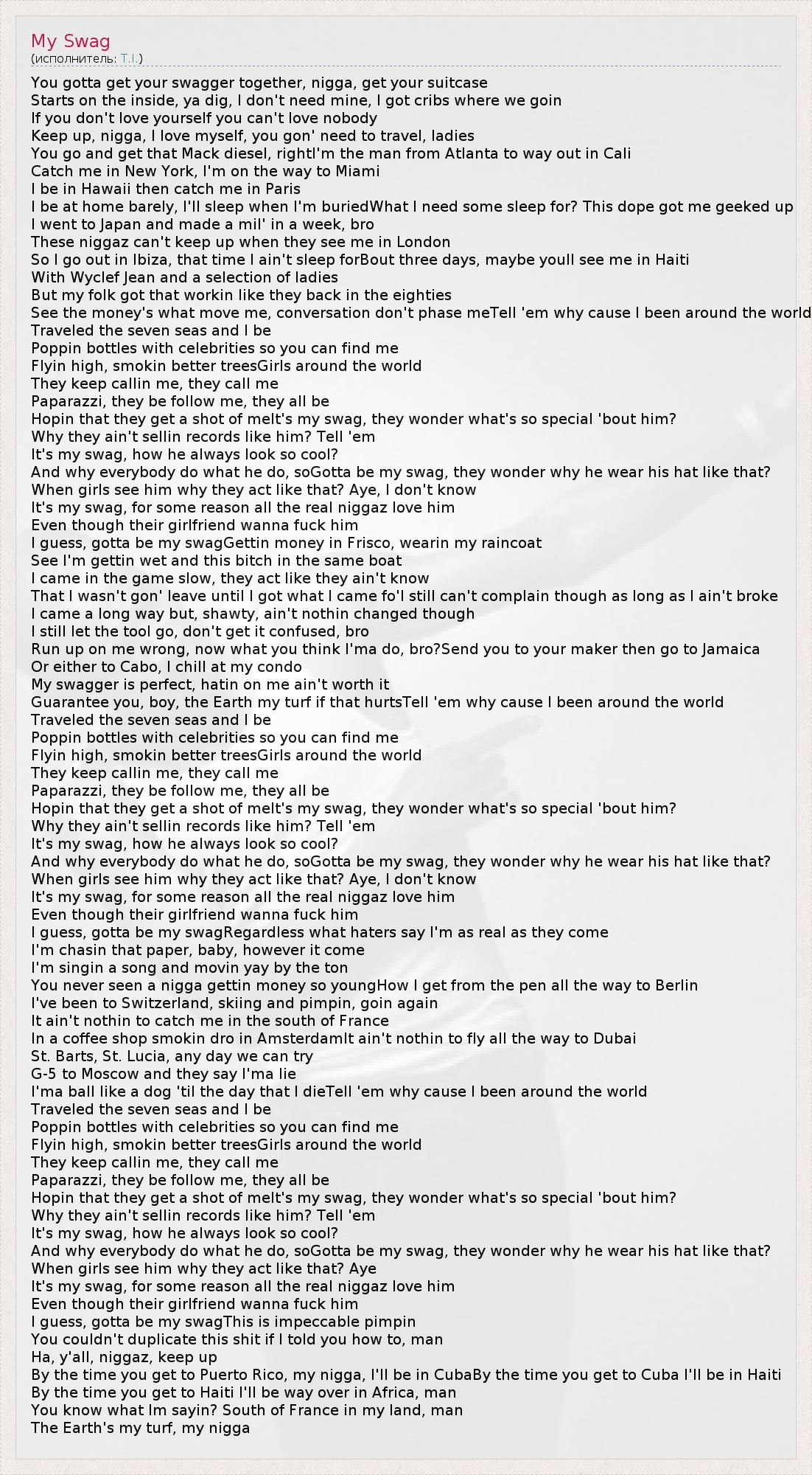 You gotta get your swagger together, nigga, get your suitcase Starts on the inside, ya dig, I don't need mine, I got cribs where we goin If you don't love yourself you can't love nobody Keep up, nigga, I love myself, you gon' need to travel, ladies You go and get that Mack diesel, rightI'm the man from Atlanta to way out in Cali Catch me in New York, I'm on the way to Miami I be in Hawaii then catch me in Paris I be at home barely, I'll sleep when I'm buriedWhat I need some sleep for? This dope got me geeked up I went to Japan and made a mil' in a week, bro These niggaz can't keep up when they see me in London So I go out in Ibiza, that time I ain't sleep forBout three days, maybe youll see me in Haiti With Wyclef Jean and a selection of ladies But my folk got that workin like they back in the eighties See the money's what move me, conversation don't phase meTell 'em why cause I been around the world Traveled the seven seas and I be Poppin bottles with celebrities so you can find me Flyin high, smokin better treesGirls around the world They keep callin me, they call me Paparazzi, they be follow me, they all be Hopin that they get a shot of meIt's my swag, they wonder what's so special 'bout him? Why they ain't sellin records like him? Tell 'em It's my swag, how he always look so cool? And why everybody do what he do, soGotta be my swag, they wonder why he wear his hat like that? When girls see him why they act like that? Aye, I don't know It's my swag, for some reason all the real niggaz love him Even though their girlfriend wanna fuck him I guess, gotta be my swagGettin money in Frisco, wearin my raincoat See I'm gettin wet and this bitch in the same boat I came in the game slow, they act like they ain't know That I wasn't gon' leave until I got what I came fo'I still can't complain though as long as I ain't broke I came a long way but, shawty, ain't nothin changed though I still let the tool go, don't get it confused, bro Run up on me wrong, now what you think I'ma do, bro?Send you to your maker then go to Jamaica Or either to Cabo, I chill at my condo My swagger is perfect, hatin on me ain't worth it Guarantee you, boy, the Earth my turf if that hurtsTell 'em why cause I been around the world Traveled the seven seas and I be Poppin bottles with celebrities so you can find me Flyin high, smokin better treesGirls around the world They keep callin me, they call me Paparazzi, they be follow me, they all be Hopin that they get a shot of meIt's my swag, they wonder what's so special 'bout him? Why they ain't sellin records like him? Tell 'em It's my swag, how he always look so cool? And why everybody do what he do, soGotta be my swag, they wonder why he wear his hat like that? When girls see him why they act like that? Aye, I don't know It's my swag, for some reason all the real niggaz love him Even though their girlfriend wanna fuck him I guess, gotta be my swagRegardless what haters say I'm as real as they come I'm chasin that paper, baby, however it come I'm singin a song and movin yay by the ton You never seen a nigga gettin money so youngHow I get from the pen all the way to Berlin I've been to Switzerland, skiing and pimpin, goin again It ain't nothin to catch me in the south of France In a coffee shop smokin dro in AmsterdamIt ain't nothin to fly all the way to Dubai St. Barts, St. Lucia, any day we can try G-5 to Moscow and they say I'ma lie I'ma ball like a dog 'til the day that I dieTell 'em why cause I been around the world Traveled the seven seas and I be Poppin bottles with celebrities so you can find me Flyin high, smokin better treesGirls around the world They keep callin me, they call me Paparazzi, they be follow me, they all be Hopin that they get a shot of meIt's my swag, they wonder what's so special 'bout him? Why they ain't sellin records like him? Tell 'em It's my swag, how he always look so cool? And why everybody do what he do, soGotta be my swag, they wonder why he wear his hat like that? When girls see him why they act like that? Aye It's my swag, for some reason all the real niggaz love him Even though their girlfriend wanna fuck him I guess, gotta be my swagThis is impeccable pimpin You couldn't duplicate this shit if I told you how to, man Ha, y'all, niggaz, keep up By the time you get to Puerto Rico, my nigga, I'll be in CubaBy the time you get to Cuba I'll be in Haiti By the time you get to Haiti I'll be way over in Africa, man You know what Im sayin? South of France in my land, man The Earth's my turf, my nigga