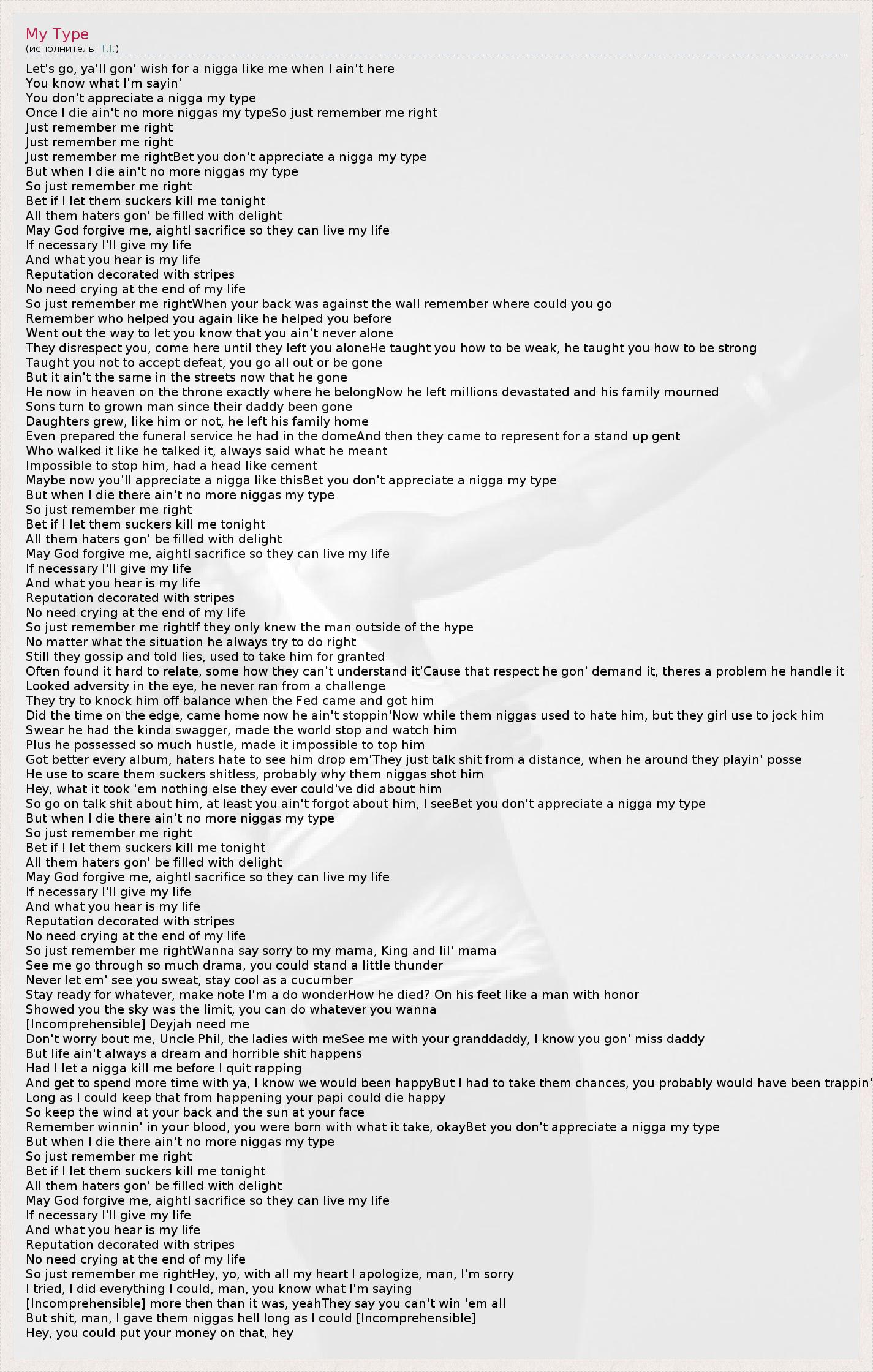 Let's go, ya'll gon' wish for a nigga like me when I ain't here You know what I'm sayin' You don't appreciate a nigga my type Once I die ain't no more niggas my typeSo just remember me right Just remember me right Just remember me right Just remember me rightBet you don't appreciate a nigga my type But when I die ain't no more niggas my type So just remember me right Bet if I let them suckers kill me tonight All them haters gon' be filled with delight May God forgive me, aightI sacrifice so they can live my life If necessary I'll give my life And what you hear is my life Reputation decorated with stripes No need crying at the end of my life So just remember me rightWhen your back was against the wall remember where could you go Remember who helped you again like he helped you before Went out the way to let you know that you ain't never alone They disrespect you, come here until they left you aloneHe taught you how to be weak, he taught you how to be strong Taught you not to accept defeat, you go all out or be gone But it ain't the same in the streets now that he gone He now in heaven on the throne exactly where he belongNow he left millions devastated and his family mourned Sons turn to grown man since their daddy been gone Daughters grew, like him or not, he left his family home Even prepared the funeral service he had in the domeAnd then they came to represent for a stand up gent Who walked it like he talked it, always said what he meant Impossible to stop him, had a head like cement Maybe now you'll appreciate a nigga like thisBet you don't appreciate a nigga my type But when I die there ain't no more niggas my type So just remember me right Bet if I let them suckers kill me tonight All them haters gon' be filled with delight May God forgive me, aightI sacrifice so they can live my life If necessary I'll give my life And what you hear is my life Reputation decorated with stripes No need crying at the end of my life So just remember me rightIf they only knew the man outside of the hype No matter what the situation he always try to do right Still they gossip and told lies, used to take him for granted Often found it hard to relate, some how they can't understand it'Cause that respect he gon' demand it, theres a problem he handle it Looked adversity in the eye, he never ran from a challenge They try to knock him off balance when the Fed came and got him Did the time on the edge, came home now he ain't stoppin'Now while them niggas used to hate him, but they girl use to jock him Swear he had the kinda swagger, made the world stop and watch him Plus he possessed so much hustle, made it impossible to top him Got better every album, haters hate to see him drop em'They just talk shit from a distance, when he around they playin' posse He use to scare them suckers shitless, probably why them niggas shot him Hey, what it took 'em nothing else they ever could've did about him So go on talk shit about him, at least you ain't forgot about him, I seeBet you don't appreciate a nigga my type But when I die there ain't no more niggas my type So just remember me right Bet if I let them suckers kill me tonight All them haters gon' be filled with delight May God forgive me, aightI sacrifice so they can live my life If necessary I'll give my life And what you hear is my life Reputation decorated with stripes No need crying at the end of my life So just remember me rightWanna say sorry to my mama, King and lil' mama See me go through so much drama, you could stand a little thunder Never let em' see you sweat, stay cool as a cucumber Stay ready for whatever, make note I'm a do wonderHow he died? On his feet like a man with honor Showed you the sky was the limit, you can do whatever you wanna [Incomprehensible] Deyjah need me Don't worry bout me, Uncle Phil, the ladies with meSee me with your granddaddy, I know you gon' miss daddy But life ain't always a dream and horrible shit happens Had I let a nigga kill me before I quit rapping And get to spend more time with ya, I know we would been happyBut I had to take them chances, you probably would have been trappin' Long as I could keep that from happening your papi could die happy So keep the wind at your back and the sun at your face Remember winnin' in your blood, you were born with what it take, okayBet you don't appreciate a nigga my type But when I die there ain't no more niggas my type So just remember me right Bet if I let them suckers kill me tonight All them haters gon' be filled with delight May God forgive me, aightI sacrifice so they can live my life If necessary I'll give my life And what you hear is my life Reputation decorated with stripes No need crying at the end of my life So just remember me rightHey, yo, with all my heart I apologize, man, I'm sorry I tried, I did everything I could, man, you know what I'm saying [Incomprehensible] more then than it was, yeahThey say you can't win 'em all But shit, man, I gave them niggas hell long as I could [Incomprehensible] Hey, you could put your money on that, hey