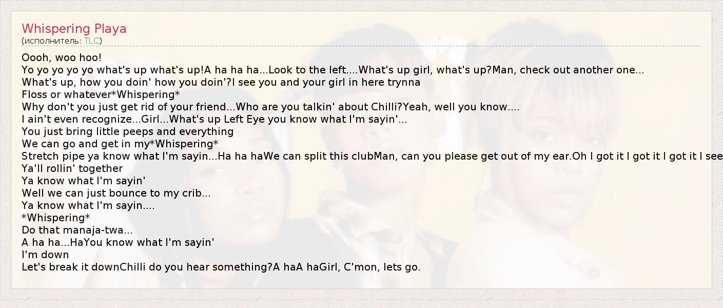 Oooh, woo hoo! Yo yo yo yo yo what's up what's up!A ha ha ha...Look to the left....What's up girl, what's up?Man, check out another one... What's up, how you doin' how you doin'?I see you and your girl in here trynna Floss or whatever*Whispering* Why don't you just get rid of your friend...Who are you talkin' about Chilli?Yeah, well you know.... I ain't even recognize...Girl...What's up Left Eye you know what I'm sayin'... You just bring little peeps and everything We can go and get in my*Whispering* Stretch pipe ya know what I'm sayin...Ha ha haWe can split this clubMan, can you please get out of my ear.Oh I got it I got it I got it I see Ya'll rollin' together Ya know what I'm sayin' Well we can just bounce to my crib... Ya know what I'm sayin.... *Whispering* Do that manaja-twa... A ha ha...HaYou know what I'm sayin' I'm down Let's break it downChilli do you hear something?A haA haGirl, C'mon, lets go.
