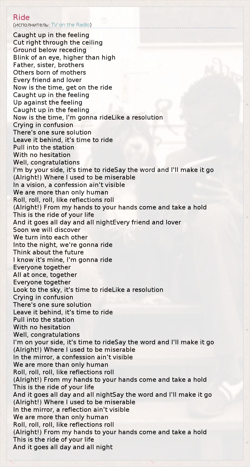 Это интересно:TV on the Radio — нью-йоркская инди-рок группа, образованная в 2001 году. Стиль группы сочетает в себе такие жанры, как инди-рок, пост-панк, фанк, трип-хоп соул и электронная музыка (glitch, dubstep…). TV on the Radio дебютировали в 2002 году мини-альбомом «OK Calculator», выпущенным на собственные средства. Через два года коллектив записал пластинку «Desperate Youth, Blood Thirsty Babes», которая была удостоена престижной премии Shortlist... продолжение