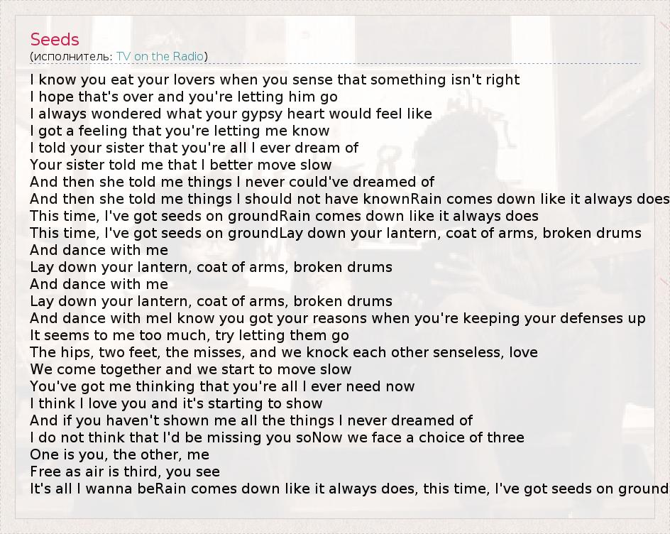 Это интересно:TV on the Radio — нью-йоркская инди-рок группа, образованная в 2001 году. Стиль группы сочетает в себе такие жанры, как инди-рок, пост-панк, фанк, трип-хоп соул и электронная музыка (glitch, dubstep…). TV on the Radio дебютировали в 2002 году мини-альбомом «OK Calculator», выпущенным на собственные средства. Через два года коллектив записал пластинку «Desperate Youth, Blood Thirsty Babes», которая была удостоена престижной премии Shortlist... продолжение