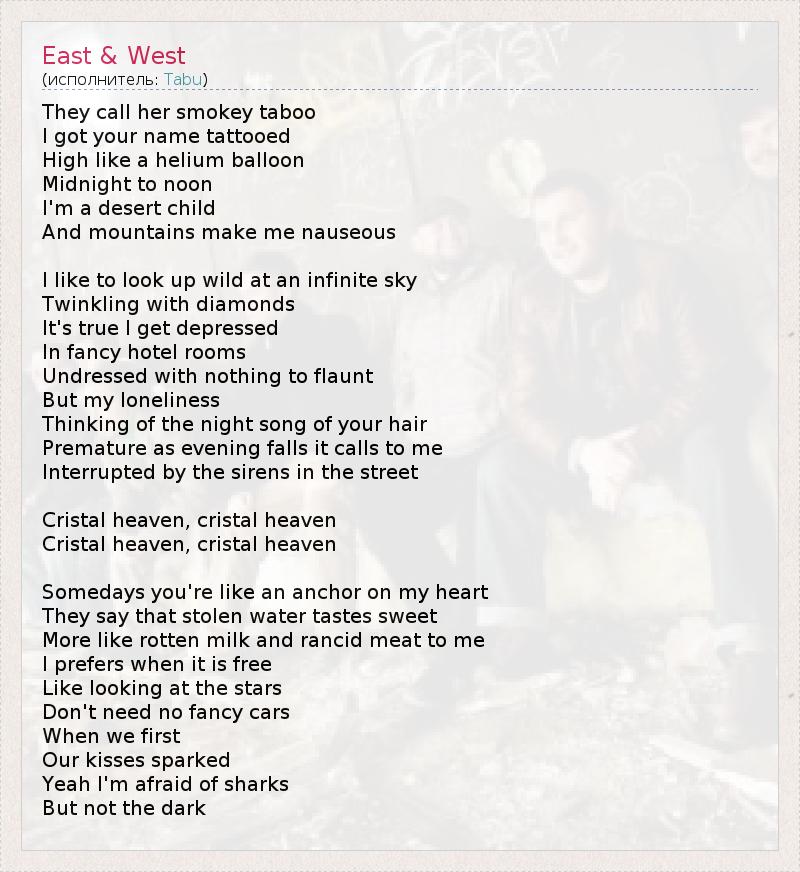 They call her smokey taboo I got your name tattooed High like a helium balloon Midnight to noon I'm a desert child And mountains make me nauseous I like to look up wild at an infinite sky Twinkling with diamonds It's true I get depressed In fancy hotel rooms Undressed with nothing to flaunt But my loneliness Thinking of the night song of your hair Premature as evening falls it calls to me Interrupted by the sirens in the street Cristal heaven, cristal heaven Cristal heaven, cristal heaven Somedays you're like an anchor on my heart They say that stolen water tastes sweet More like rotten milk and rancid meat to me I prefers when it is free Like looking at the stars Don't need no fancy cars When we first Our kisses sparked Yeah I'm afraid of sharks But not the dark