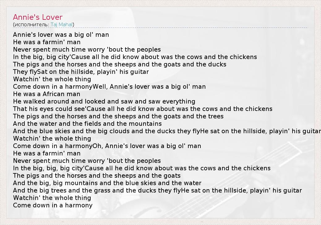 Come down in a harmonyWell, Annie's lover was a big ol' man