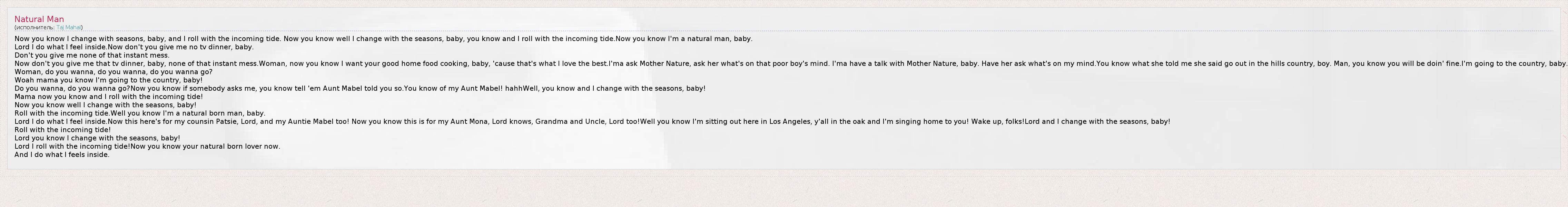 Now you know I change with seasons, baby, and I roll with the incoming tide. Now you know well I change with the seasons, baby, you know and I roll with the incoming tide.Now you know I'm a natural man, baby. Lord I do what I feel inside.Now don't you give me no tv dinner, baby. Don't you give me none of that instant mess. Now don't you give me that tv dinner, baby, none of that instant mess.Woman, now you know I want your good home food cooking, baby, 'cause that's what I love the best.I'ma ask Mother Nature, ask her what's on that poor boy's mind. I'ma have a talk with Mother Nature, baby. Have her ask what's on my mind.You know what she told me she said go out in the hills country, boy. Man, you know you will be doin' fine.I'm going to the country, baby. Woman, do you wanna, do you wanna, do you wanna go? Woah mama you know I'm going to the country, baby! Do you wanna, do you wanna go?Now you know if somebody asks me, you know tell 'em Aunt Mabel told you so.You know of my Aunt Mabel! hahhWell, you know and I change with the seasons, baby! Mama now you know and I roll with the incoming tide! Now you know well I change with the seasons, baby! Roll with the incoming tide.Well you know I'm a natural born man, baby. Lord I do what I feel inside.Now this here's for my counsin Patsie, Lord, and my Auntie Mabel too! Now you know this is for my Aunt Mona, Lord knows, Grandma and Uncle, Lord too!Well you know I'm sitting out here in Los Angeles, y'all in the oak and I'm singing home to you! Wake up, folks!Lord and I change with the seasons, baby! Roll with the incoming tide! Lord you know I change with the seasons, baby! Lord I roll with the incoming tide!Now you know your natural born lover now. And I do what I feels inside.