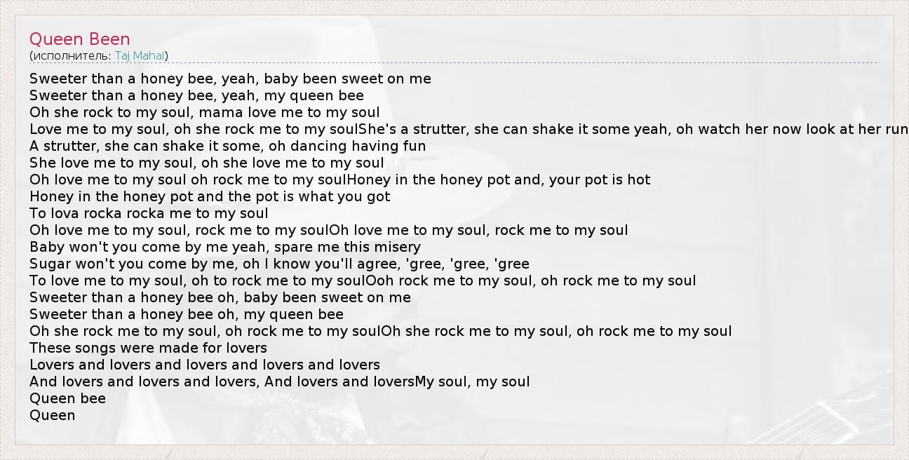 Sweeter than a honey bee, yeah, baby been sweet on me Sweeter than a honey bee, yeah, my queen bee Oh she rock to my soul, mama love me to my soul Love me to my soul, oh she rock me to my soulShe's a strutter, she can shake it some yeah, oh watch her now look at her run A strutter, she can shake it some, oh dancing having fun She love me to my soul, oh she love me to my soul Oh love me to my soul oh rock me to my soulHoney in the honey pot and, your pot is hot Honey in the honey pot and the pot is what you got To lova rocka rocka me to my soul Oh love me to my soul, rock me to my soulOh love me to my soul, rock me to my soul Baby won't you come by me yeah, spare me this misery Sugar won't you come by me, oh I know you'll agree, 'gree, 'gree, 'gree To love me to my soul, oh to rock me to my soulOoh rock me to my soul, oh rock me to my soul Sweeter than a honey bee oh, baby been sweet on me Sweeter than a honey bee oh, my queen bee Oh she rock me to my soul, oh rock me to my soulOh she rock me to my soul, oh rock me to my soul These songs were made for lovers Lovers and lovers and lovers and lovers and lovers And lovers and lovers and lovers, And lovers and loversMy soul, my soul Queen bee Queen