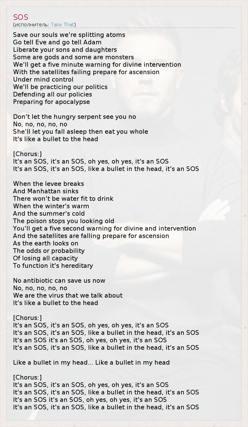 Спасите наши души! Мы распадаемся на атомы Скажите Еве и Адаму Освободить своих сыновей и дочерей Кто-то из них - боги, кто-то - чудовища У нас будет пять минут, чтобы получить предупреждение о божественном вмешательстве, Когда павшие союзники будут готовиться к вознесению, Подвергнутые контролю над разумом, Мы будем вести свою политику, Защищая все свои принципы И готовясь к апокалипсису Да не увидит вас голодный змей-искуситель, нет Нет, нет, нет, нет, нет Он дождётся, пока вы заснёте, затем съест вас целиком Это как выстрел в голову [Припев:] Это сигнал SOS, это сигнал SOS, да, да, это сигнал SOS Это сигнал SOS, это сигнал SOS, как выстрел в голову, это сигнал SOS Когда дамба обрушится, И Манхэттен погрузится под воду, У нас не будет питьевой воды Когда зимой станет жарко, А летом холодно, Яд прекратит ваше старение У вас будет пять минут, чтобы получить предупреждение о божественном вмешательстве, Когда павшие союзники будут готовиться к вознесению, Пока мир будет наблюдать за Вероятностью Потери всех способностей К действию; так предначертано Никакие антибиотики нас теперь не спасут Нет, нет, нет, нет, нет Мы сами - вирус, о котором мы говорим Это как выстрел в голову [Припев:] Это сигнал SOS, это сигнал SOS, да, да, это сигнал SOS Это сигнал SOS, это сигнал SOS, как выстрел в голову, это сигнал SOS Это сигнал SOS, это сигнал SOS, да, да, это сигнал SOS Это сигнал SOS, это сигнал SOS, как выстрел в голову, это сигнал SOS Как пуля в моей голове... Как пуля в моей голове [Припев:] Это сигнал SOS, это сигнал SOS, да, да, это сигнал SOS Это сигнал SOS, это сигнал SOS, как выстрел в голову, это сигнал SOS Это сигнал SOS, это сигнал SOS, да, да, это сигнал SOS Это сигнал SOS, это сигнал SOS, как выстрел в голову, это сигнал SOS