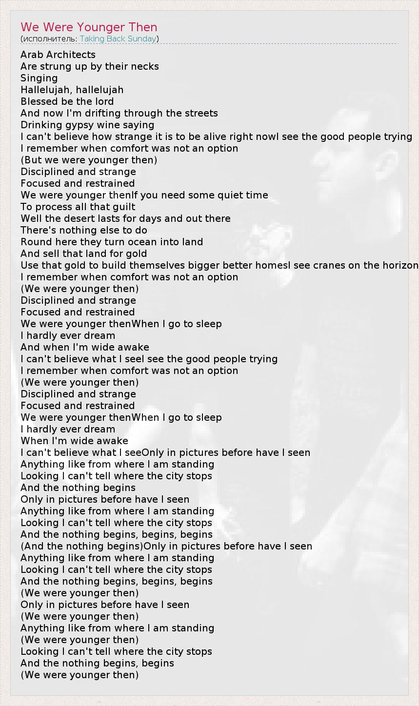 А как ты думаешь, о чем песня "We Were Younger Then" ?