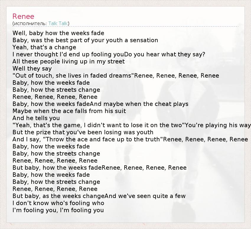 But baby, how the weeks fadeRenee, Renee, Renee, Renee