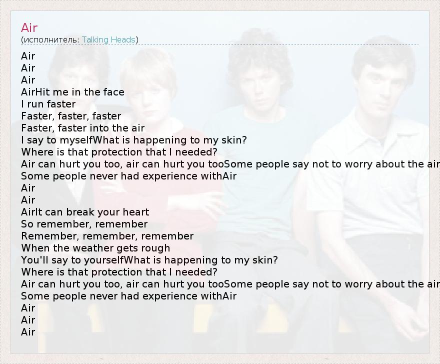 Air Air Air AirHit me in the face I run faster Faster, faster, faster Faster, faster into the air I say to myselfWhat is happening to my skin? Where is that protection that I needed? Air can hurt you too, air can hurt you tooSome people say not to worry about the air Some people never had experience withAir Air Air AirIt can break your heart So remember, remember Remember, remember, remember When the weather gets rough You'll say to yourselfWhat is happening to my skin? Where is that protection that I needed? Air can hurt you too, air can hurt you tooSome people say not to worry about the air Some people never had experience withAir Air Air Air