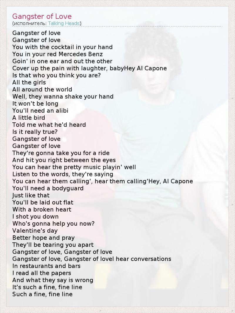 Gangster of love Gangster of love You with the cocktail in your hand You in your red Mercedes Benz Goin' in one ear and out the other Cover up the pain with laughter, babyHey Al Capone Is that who you think you are? All the girls All around the world Well, they wanna shake your hand It won't be long You'll need an alibi A little bird Told me what he'd heard Is it really true? Gangster of love Gangster of love They're gonna take you for a ride And hit you right between the eyes You can hear the pretty music playin' well Listen to the words, they're saying You can hear them calling', hear them calling'Hey, Al Capone You'll need a bodyguard Just like that You'll be laid out flat With a broken heart I shot you down Who's gonna help you now? Valentine's day Better hope and pray They'll be tearing you apart Gangster of love, Gangster of love Gangster of love, Gangster of loveI hear conversations In restaurants and bars I read all the papers And what they say is wrong It's such a fine, fine line Such a fine, fine line
