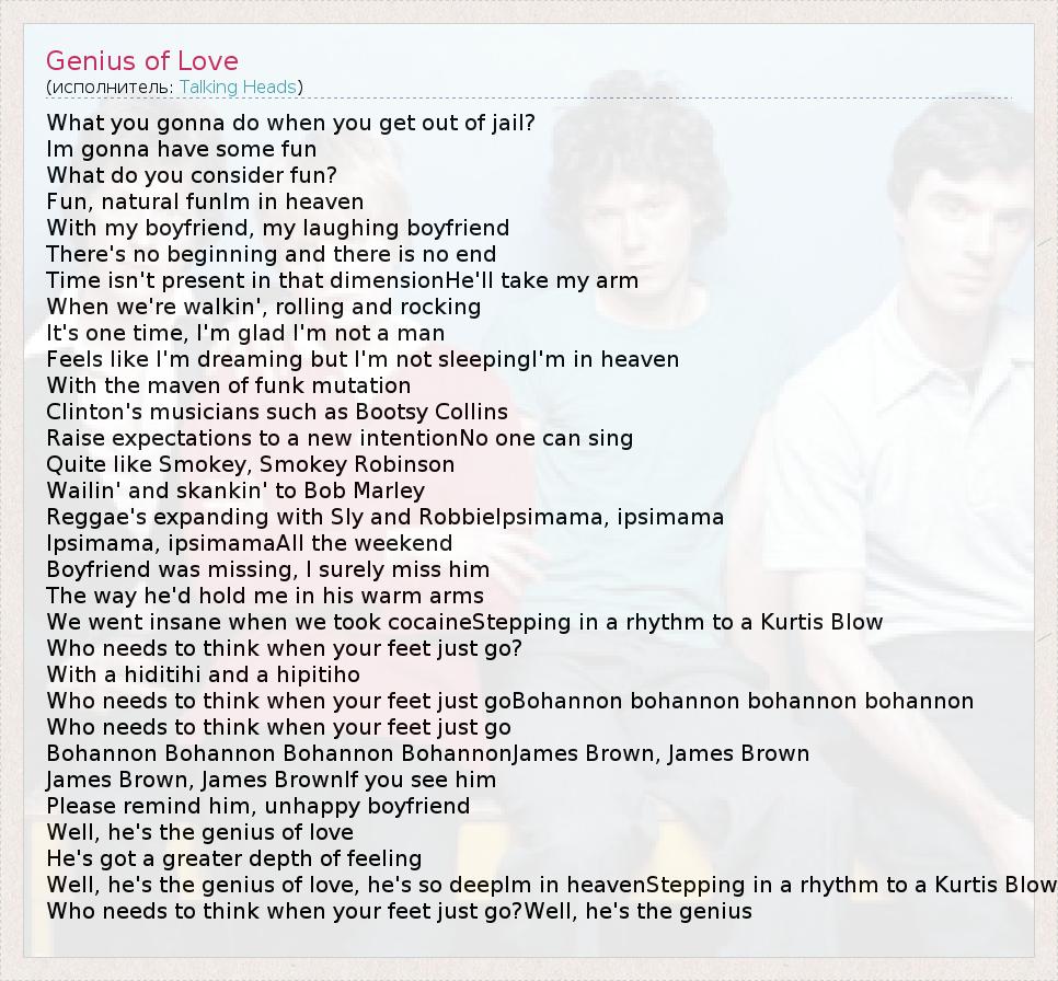 What you gonna do when you get out of jail? Im gonna have some fun What do you consider fun? Fun, natural funIm in heaven With my boyfriend, my laughing boyfriend There's no beginning and there is no end Time isn't present in that dimensionHe'll take my arm When we're walkin', rolling and rocking It's one time, I'm glad I'm not a man Feels like I'm dreaming but I'm not sleepingI'm in heaven With the maven of funk mutation Clinton's musicians such as Bootsy Collins Raise expectations to a new intentionNo one can sing Quite like Smokey, Smokey Robinson Wailin' and skankin' to Bob Marley Reggae's expanding with Sly and RobbieIpsimama, ipsimama Ipsimama, ipsimamaAll the weekend Boyfriend was missing, I surely miss him The way he'd hold me in his warm arms We went insane when we took cocaineStepping in a rhythm to a Kurtis Blow Who needs to think when your feet just go? With a hiditihi and a hipitiho Who needs to think when your feet just goBohannon bohannon bohannon bohannon Who needs to think when your feet just go Bohannon Bohannon Bohannon BohannonJames Brown, James Brown James Brown, James BrownIf you see him Please remind him, unhappy boyfriend Well, he's the genius of love He's got a greater depth of feeling Well, he's the genius of love, he's so deepIm in heavenStepping in a rhythm to a Kurtis Blow Who needs to think when your feet just go?Well, he's the genius