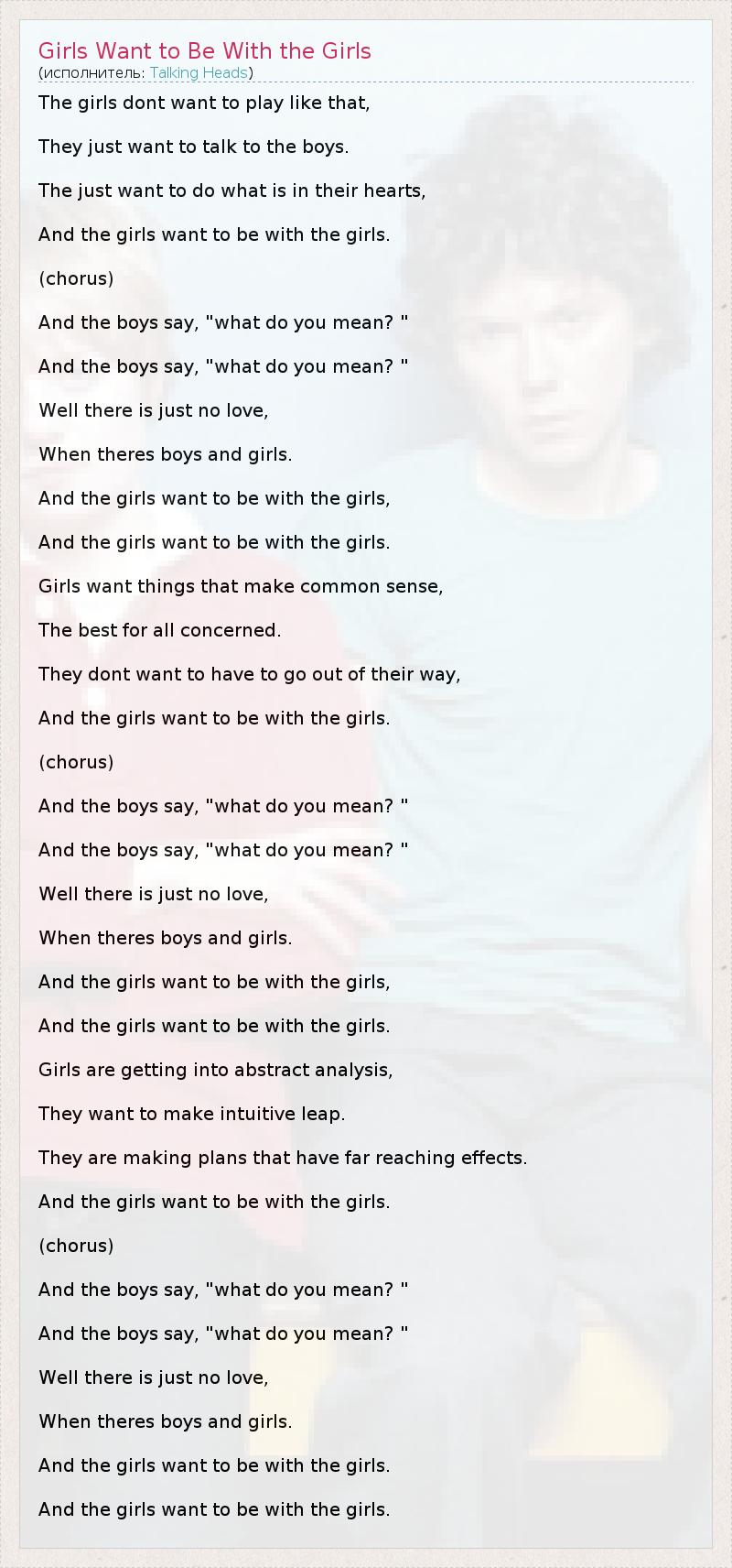 The girls dont want to play like that, They just want to talk to the boys. The just want to do what is in their hearts, And the girls want to be with the girls. (chorus) And the boys say, "what do you mean? " And the boys say, "what do you mean? " Well there is just no love, When theres boys and girls. And the girls want to be with the girls, And the girls want to be with the girls. Girls want things that make common sense, The best for all concerned. They dont want to have to go out of their way, And the girls want to be with the girls. (chorus) And the boys say, "what do you mean? " And the boys say, "what do you mean? " Well there is just no love, When theres boys and girls. And the girls want to be with the girls, And the girls want to be with the girls. Girls are getting into abstract analysis, They want to make intuitive leap. They are making plans that have far reaching effects. And the girls want to be with the girls. (chorus) And the boys say, "what do you mean? " And the boys say, "what do you mean? " Well there is just no love, When theres boys and girls. And the girls want to be with the girls. And the girls want to be with the girls.