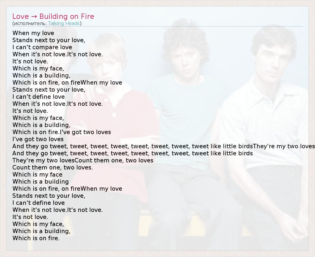 ГлавнаяИсполнителиTalking HeadsLove → Building on Fire