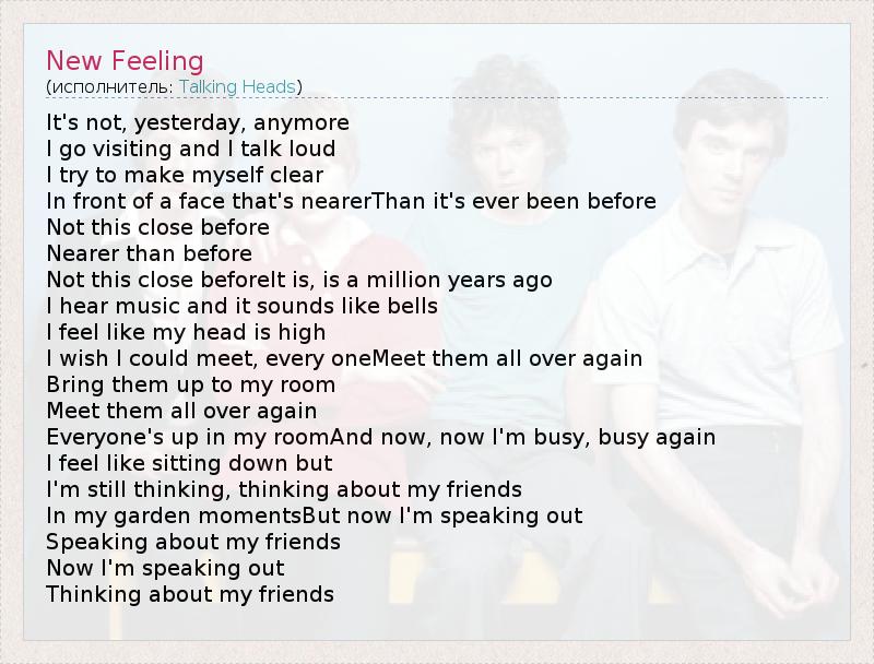 Это интересно:Talking Heads — американская рок-группа, образованная в 1975 году.Опираясь на фанк, классический минимализм и африканский рок, Talking Heads удалось создать наиболее оригинальную танцевальную музыку "новой волны". Основатели группы Дэвид Бирн и Крис Франтц вместе учились в одной из нью-йоркских школ дизайна (Бирн увлекается дизайном и живописью и по сей день); еще до того, как записать свой... продолжение
