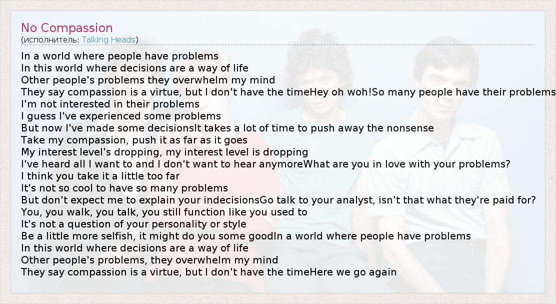 In a world where people have problems In this world where decisions are a way of life Other people's problems they overwhelm my mind They say compassion is a virtue, but I don't have the timeHey oh woh!So many people have their problems I'm not interested in their problems I guess I've experienced some problems But now I've made some decisionsIt takes a lot of time to push away the nonsense Take my compassion, push it as far as it goes My interest level's dropping, my interest level is dropping I've heard all I want to and I don't want to hear anymoreWhat are you in love with your problems? I think you take it a little too far It's not so cool to have so many problems But don't expect me to explain your indecisionsGo talk to your analyst, isn't that what they're paid for? You, you walk, you talk, you still function like you used to It's not a question of your personality or style Be a little more selfish, it might do you some goodIn a world where people have problems In this world where decisions are a way of life Other people's problems, they overwhelm my mind They say compassion is a virtue, but I don't have the timeHere we go again