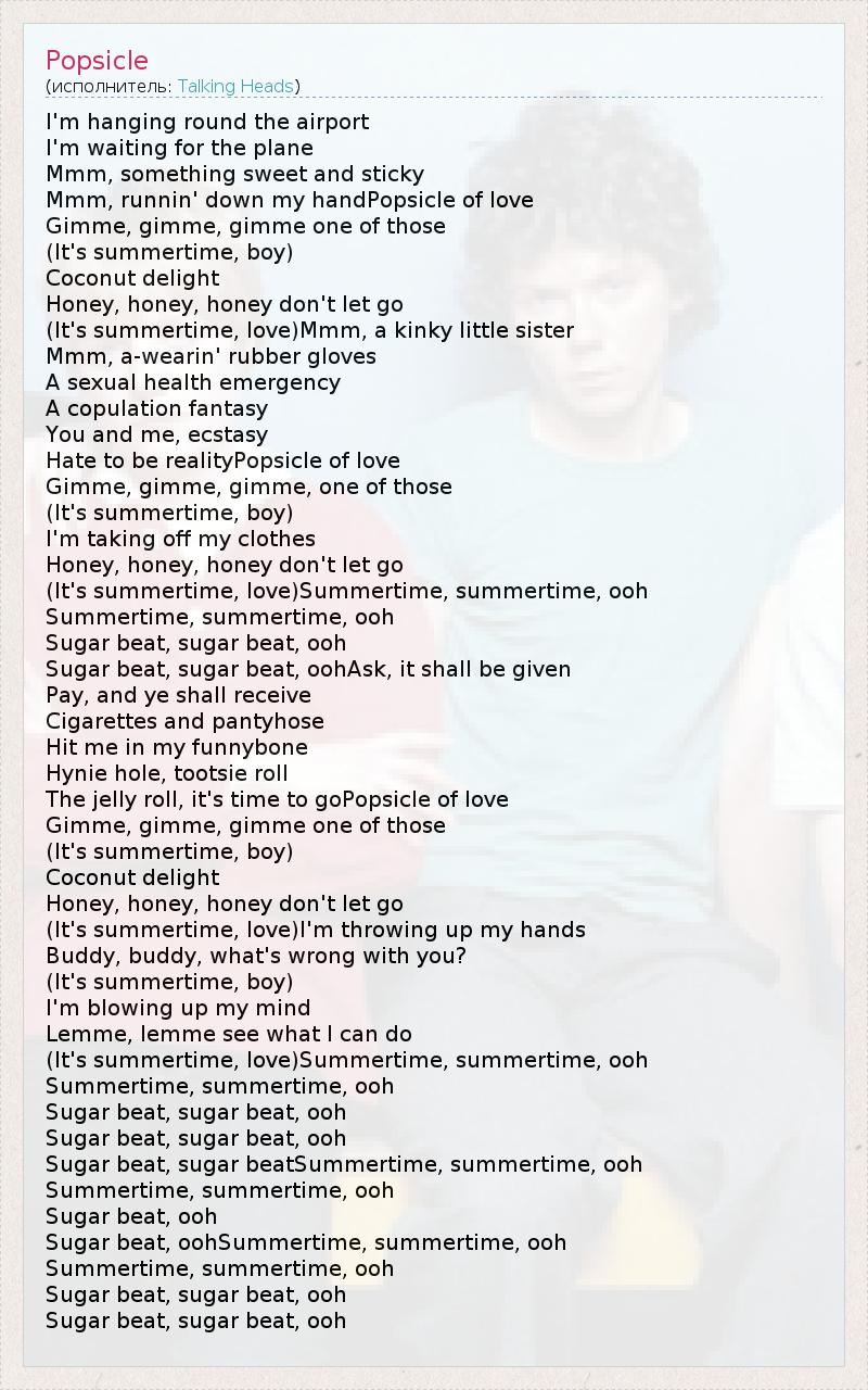 I'm hanging round the airport I'm waiting for the plane Mmm, something sweet and sticky Mmm, runnin' down my handPopsicle of love Gimme, gimme, gimme one of those (It's summertime, boy) Coconut delight Honey, honey, honey don't let go (It's summertime, love)Mmm, a kinky little sister Mmm, a-wearin' rubber gloves A sexual health emergency A copulation fantasy You and me, ecstasy Hate to be realityPopsicle of love Gimme, gimme, gimme, one of those (It's summertime, boy) I'm taking off my clothes Honey, honey, honey don't let go (It's summertime, love)Summertime, summertime, ooh Summertime, summertime, ooh Sugar beat, sugar beat, ooh Sugar beat, sugar beat, oohAsk, it shall be given Pay, and ye shall receive Cigarettes and pantyhose Hit me in my funnybone Hynie hole, tootsie roll The jelly roll, it's time to goPopsicle of love Gimme, gimme, gimme one of those (It's summertime, boy) Coconut delight Honey, honey, honey don't let go (It's summertime, love)I'm throwing up my hands Buddy, buddy, what's wrong with you? (It's summertime, boy) I'm blowing up my mind Lemme, lemme see what I can do (It's summertime, love)Summertime, summertime, ooh Summertime, summertime, ooh Sugar beat, sugar beat, ooh Sugar beat, sugar beat, ooh Sugar beat, sugar beatSummertime, summertime, ooh Summertime, summertime, ooh Sugar beat, ooh Sugar beat, oohSummertime, summertime, ooh Summertime, summertime, ooh Sugar beat, sugar beat, ooh Sugar beat, sugar beat, ooh