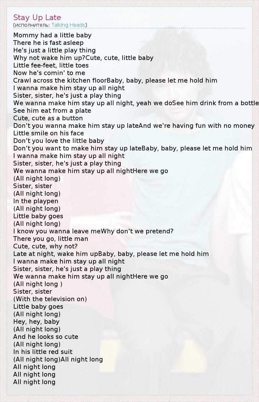 Mommy had a little baby There he is fast asleep He's just a little play thing Why not wake him up?Cute, cute, little baby Little fee-feet, little toes Now he's comin' to me Crawl across the kitchen floorBaby, baby, please let me hold him I wanna make him stay up all night Sister, sister, he's just a play thing We wanna make him stay up all night, yeah we doSee him drink from a bottle See him eat from a plate Cute, cute as a button Don't you wanna make him stay up lateAnd we're having fun with no money Little smile on his face Don't you love the little baby Don't you want to make him stay up lateBaby, baby, please let me hold him I wanna make him stay up all night Sister, sister, he's just a play thing We wanna make him stay up all nightHere we go (All night long) Sister, sister (All night long) In the playpen (All night long) Little baby goes (All night long) I know you wanna leave meWhy don't we pretend? There you go, little man Cute, cute, why not? Late at night, wake him upBaby, baby, please let me hold him I wanna make him stay up all night Sister, sister, he's just a play thing We wanna make him stay up all nightHere we go (All night long ) Sister, sister (With the television on) Little baby goes (All night long) Hey, hey, baby (All night long) And he looks so cute (All night long) In his little red suit (All night long)All night long All night long All night long All night long