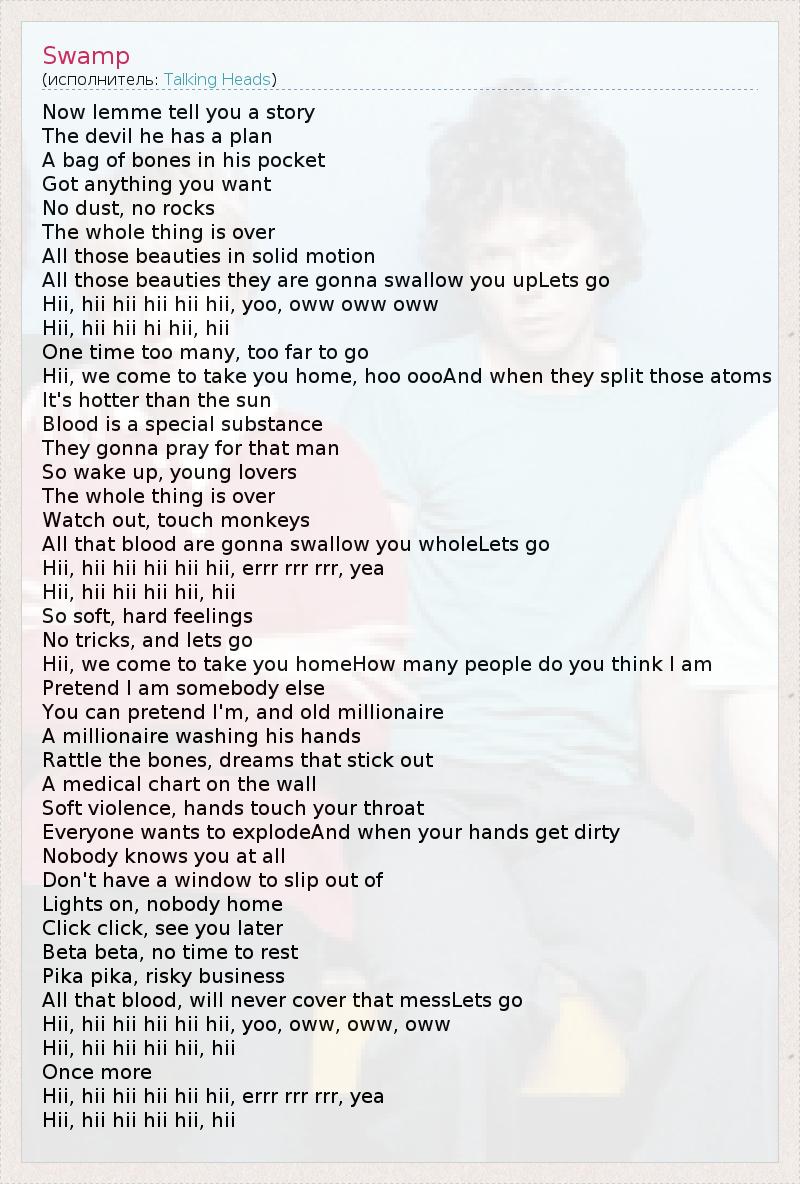 Это интересно:Talking Heads — американская рок-группа, образованная в 1975 году.Опираясь на фанк, классический минимализм и африканский рок, Talking Heads удалось создать наиболее оригинальную танцевальную музыку "новой волны". Основатели группы Дэвид Бирн и Крис Франтц вместе учились в одной из нью-йоркских школ дизайна (Бирн увлекается дизайном и живописью и по сей день); еще до того, как записать свой... продолжение
