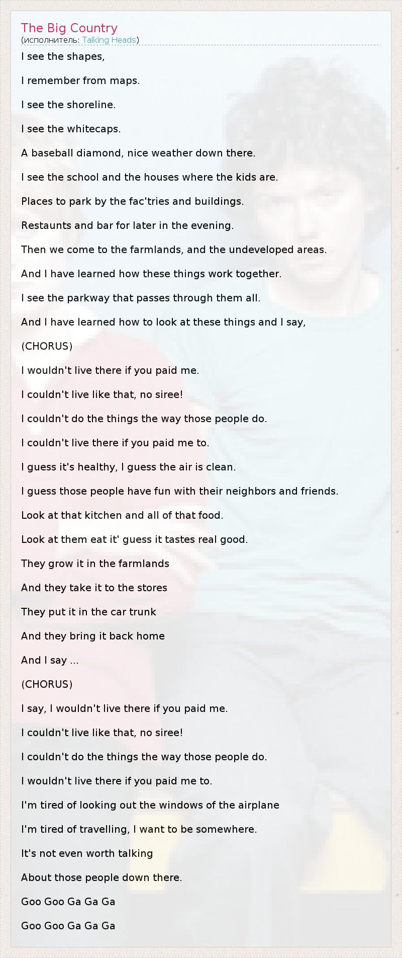 I see the shapes, I remember from maps. I see the shoreline. I see the whitecaps. A baseball diamond, nice weather down there. I see the school and the houses where the kids are. Places to park by the fac'tries and buildings. Restaunts and bar for later in the evening. Then we come to the farmlands, and the undeveloped areas. And I have learned how these things work together. I see the parkway that passes through them all. And I have learned how to look at these things and I say, (CHORUS) I wouldn't live there if you paid me. I couldn't live like that, no siree! I couldn't do the things the way those people do. I couldn't live there if you paid me to. I guess it's healthy, I guess the air is clean. I guess those people have fun with their neighbors and friends. Look at that kitchen and all of that food. Look at them eat it' guess it tastes real good. They grow it in the farmlands And they take it to the stores They put it in the car trunk And they bring it back home And I say ... (CHORUS) I say, I wouldn't live there if you paid me. I couldn't live like that, no siree! I couldn't do the things the way those people do. I wouldn't live there if you paid me to. I'm tired of looking out the windows of the airplane I'm tired of travelling, I want to be somewhere. It's not even worth talking About those people down there. Goo Goo Ga Ga Ga Goo Goo Ga Ga Ga