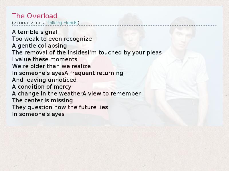 Это интересно:Talking Heads — американская рок-группа, образованная в 1975 году.Опираясь на фанк, классический минимализм и африканский рок, Talking Heads удалось создать наиболее оригинальную танцевальную музыку "новой волны". Основатели группы Дэвид Бирн и Крис Франтц вместе учились в одной из нью-йоркских школ дизайна (Бирн увлекается дизайном и живописью и по сей день); еще до того, как записать свой... продолжение