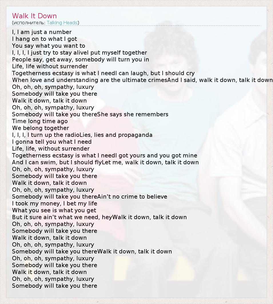 I, I am just a number I hang on to what I got You say what you want to I, I, I, I just try to stay aliveI put myself together People say, get away, somebody will turn you in Life, life without surrender Togetherness ecstasy is what I needI can laugh, but I should cry When love and understanding are the ultimate crimesAnd I said, walk it down, talk it down Oh, oh, oh, sympathy, luxury Somebody will take you there Walk it down, talk it down Oh, oh, oh, sympathy, luxury Somebody will take you thereShe says she remembers Time long time ago We belong together I, I, I, I turn up the radioLies, lies and propaganda I gonna tell you what I need Life, life, without surrender Togetherness ecstasy is what I needI got yours and you got mine And I can swim, but I should flyLet me, walk it down, talk it down Oh, oh, oh, sympathy, luxury Somebody will take you there Walk it down, talk it down Oh, oh, oh, sympathy, luxury Somebody will take you thereAin't no crime to believe I took my money, I bet my life What you see is what you get But it sure ain't what we need, heyWalk it down, talk it down Oh, oh, oh, sympathy, luxury Somebody will take you there Walk it down, talk it down Oh, oh, oh, sympathy, luxury Somebody will take you thereWalk it down, talk it down Oh, oh, oh, sympathy, luxury Somebody will take you there Walk it down, talk it down Oh, oh, oh, sympathy, luxury Somebody will take you there