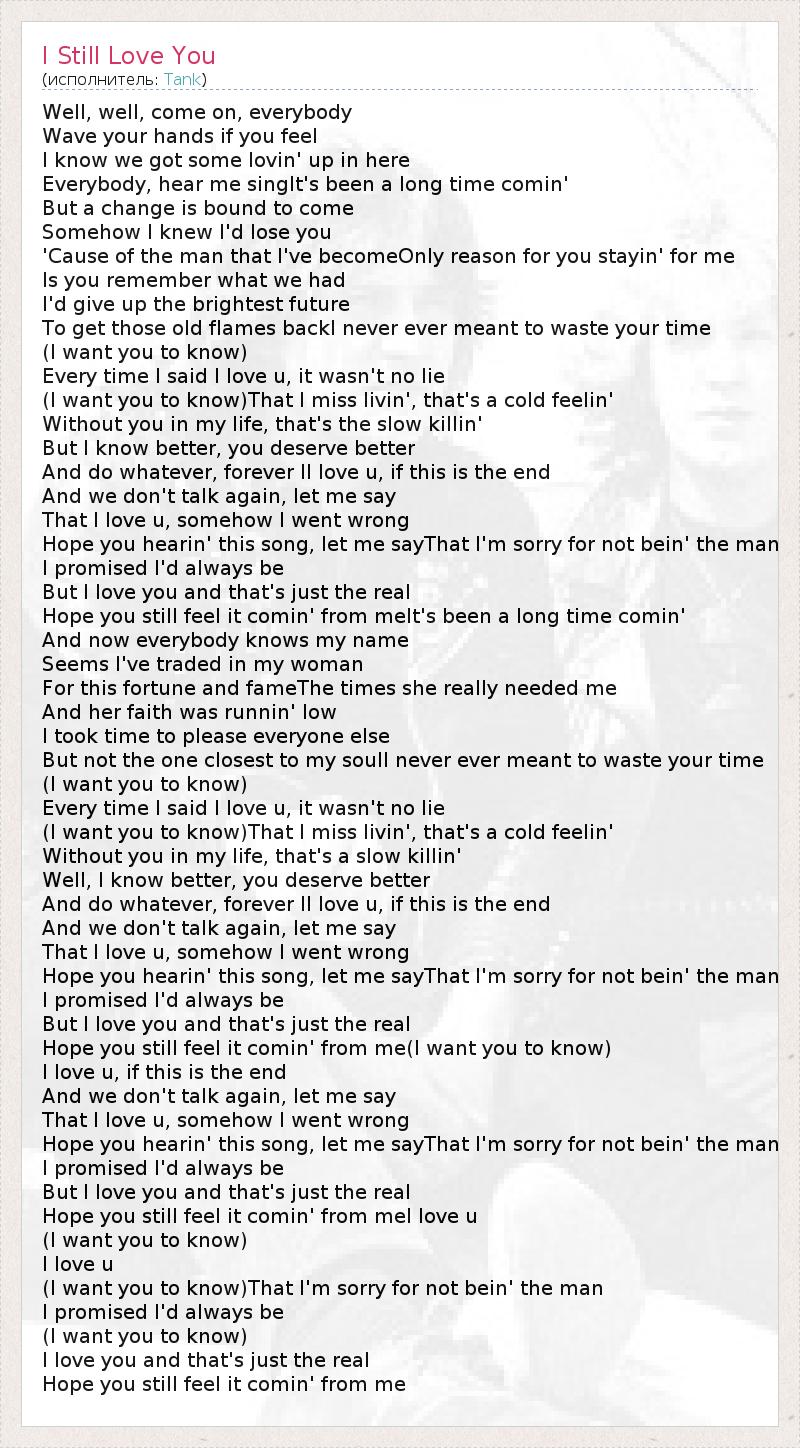 Well, well, come on, everybody Wave your hands if you feel I know we got some lovin' up in here Everybody, hear me singIt's been a long time comin' But a change is bound to come Somehow I knew I'd lose you 'Cause of the man that I've becomeOnly reason for you stayin' for me Is you remember what we had I'd give up the brightest future To get those old flames backI never ever meant to waste your time (I want you to know) Every time I said I love u, it wasn't no lie (I want you to know)That I miss livin', that's a cold feelin' Without you in my life, that's the slow killin' But I know better, you deserve better And do whatever, forever II love u, if this is the end And we don't talk again, let me say That I love u, somehow I went wrong Hope you hearin' this song, let me sayThat I'm sorry for not bein' the man I promised I'd always be But I love you and that's just the real Hope you still feel it comin' from meIt's been a long time comin' And now everybody knows my name Seems I've traded in my woman For this fortune and fameThe times she really needed me And her faith was runnin' low I took time to please everyone else But not the one closest to my soulI never ever meant to waste your time (I want you to know) Every time I said I love u, it wasn't no lie (I want you to know)That I miss livin', that's a cold feelin' Without you in my life, that's a slow killin' Well, I know better, you deserve better And do whatever, forever II love u, if this is the end And we don't talk again, let me say That I love u, somehow I went wrong Hope you hearin' this song, let me sayThat I'm sorry for not bein' the man I promised I'd always be But I love you and that's just the real Hope you still feel it comin' from me(I want you to know) I love u, if this is the end And we don't talk again, let me say That I love u, somehow I went wrong Hope you hearin' this song, let me sayThat I'm sorry for not bein' the man I promised I'd always be But I love you and that's just the real Hope you still feel it comin' from meI love u (I want you to know) I love u (I want you to know)That I'm sorry for not bein' the man I promised I'd always be (I want you to know) I love you and that's just the real Hope you still feel it comin' from me
