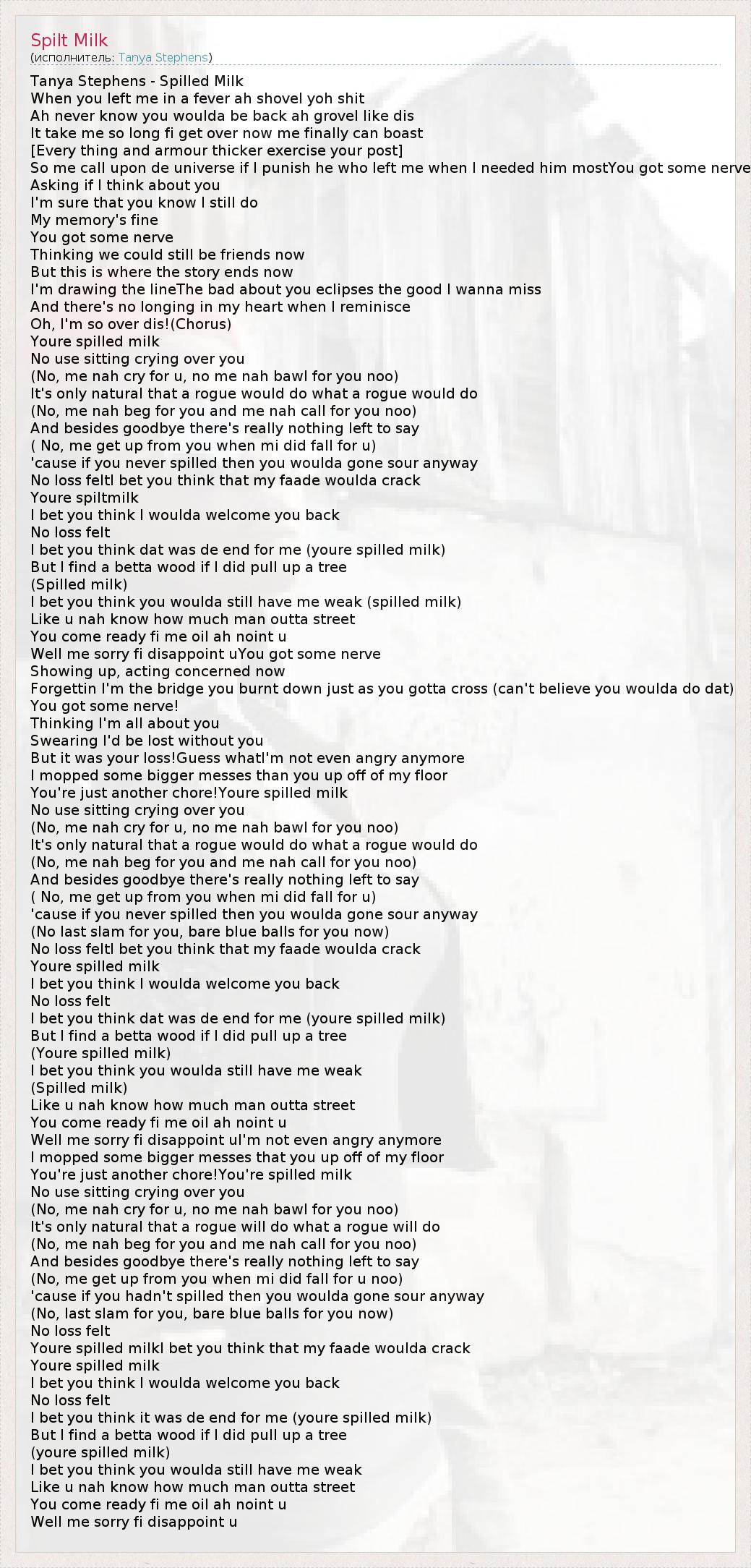 Tanya Stephens - Spilled Milk When you left me in a fever ah shovel yoh shit Ah never know you woulda be back ah grovel like dis It take me so long fi get over now me finally can boast [Every thing and armour thicker exercise your post] So me call upon de universe if I punish he who left me when I needed him mostYou got some nerve Asking if I think about you I'm sure that you know I still do My memory's fine You got some nerve Thinking we could still be friends now But this is where the story ends now I'm drawing the lineThe bad about you eclipses the good I wanna miss And there's no longing in my heart when I reminisce Oh, I'm so over dis!(Chorus) Youre spilled milk No use sitting crying over you (No, me nah cry for u, no me nah bawl for you noo) It's only natural that a rogue would do what a rogue would do (No, me nah beg for you and me nah call for you noo) And besides goodbye there's really nothing left to say ( No, me get up from you when mi did fall for u) 'cause if you never spilled then you woulda gone sour anyway No loss feltI bet you think that my faade woulda crack Youre spiltmilk I bet you think I woulda welcome you back No loss felt I bet you think dat was de end for me (youre spilled milk) But I find a betta wood if I did pull up a tree (Spilled milk) I bet you think you woulda still have me weak (spilled milk) Like u nah know how much man outta street You come ready fi me oil ah noint u Well me sorry fi disappoint uYou got some nerve Showing up, acting concerned now Forgettin I'm the bridge you burnt down just as you gotta cross (can't believe you woulda do dat) You got some nerve! Thinking I'm all about you Swearing I'd be lost without you But it was your loss!Guess whatI'm not even angry anymore I mopped some bigger messes than you up off of my floor You're just another chore!Youre spilled milk No use sitting crying over you (No, me nah cry for u, no me nah bawl for you noo) It's only natural that a rogue would do what a rogue would do (No, me nah beg for you and me nah call for you noo) And besides goodbye there's really nothing left to say ( No, me get up from you when mi did fall for u) 'cause if you never spilled then you woulda gone sour anyway (No last slam for you, bare blue balls for you now) No loss feltI bet you think that my faade woulda crack Youre spilled milk I bet you think I woulda welcome you back No loss felt I bet you think dat was de end for me (youre spilled milk) But I find a betta wood if I did pull up a tree (Youre spilled milk) I bet you think you woulda still have me weak (Spilled milk) Like u nah know how much man outta street You come ready fi me oil ah noint u Well me sorry fi disappoint uI'm not even angry anymore I mopped some bigger messes that you up off of my floor You're just another chore!You're spilled milk No use sitting crying over you (No, me nah cry for u, no me nah bawl for you noo) It's only natural that a rogue will do what a rogue will do (No, me nah beg for you and me nah call for you noo) And besides goodbye there's really nothing left to say (No, me get up from you when mi did fall for u noo) 'cause if you hadn't spilled then you woulda gone sour anyway (No, last slam for you, bare blue balls for you now) No loss felt Youre spilled milkI bet you think that my faade woulda crack Youre spilled milk I bet you think I woulda welcome you back No loss felt I bet you think it was de end for me (youre spilled milk) But I find a betta wood if I did pull up a tree (youre spilled milk) I bet you think you woulda still have me weak Like u nah know how much man outta street You come ready fi me oil ah noint u Well me sorry fi disappoint u