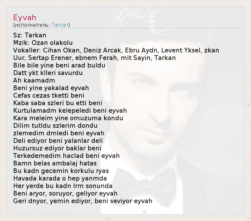 Это интересно:Тарка́н Теветоолу (тур. Tarkan Tevetoğlu; 17 октября 1972, Альцай, Рейнланд-Пфальц), более известный как просто Тарка́н — турецкий певец, лауреат многих премий как в Турции, так и в мире. Начал свою сольную карьеру в начале 1992 года. Таркан выпустил несколько платиновых альбомов, распроданных общих количеством около 25 миллионов копий. Он также занимается продюсированием и является владельцем музыкальной... продолжение