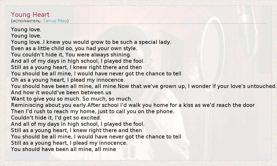 Young love. Young love. Young love..I knew you would grow to be such a special lady. Even as a little child oo, you had your own style. You couldn't hide it, You were always shining. And all of my days in high school, I played the fool. Still as a young heart, I knew right there and then You should be all mine, I would have never got the chance to tell Oh as a young heart, I plead my innocence. You should have been all mine, all mine.Now that we've grown up, I wonder if your love's untouched. And how it would've been between us Want to give you so much. So much, so much. Reminiscing about you early.After school I'd walk you home for a kiss as we'd reach the door Then I'd rush to reach my home, just to call you on the phone. Couldn't hide it, I'd get so excited. And all of my days in high school, I played the fool. Still as a young heart, I knew right there and then You should be all mine, I would have never got the chance to tell Still as a young heart, I plead my innocence. You should have been all mine, all mine
