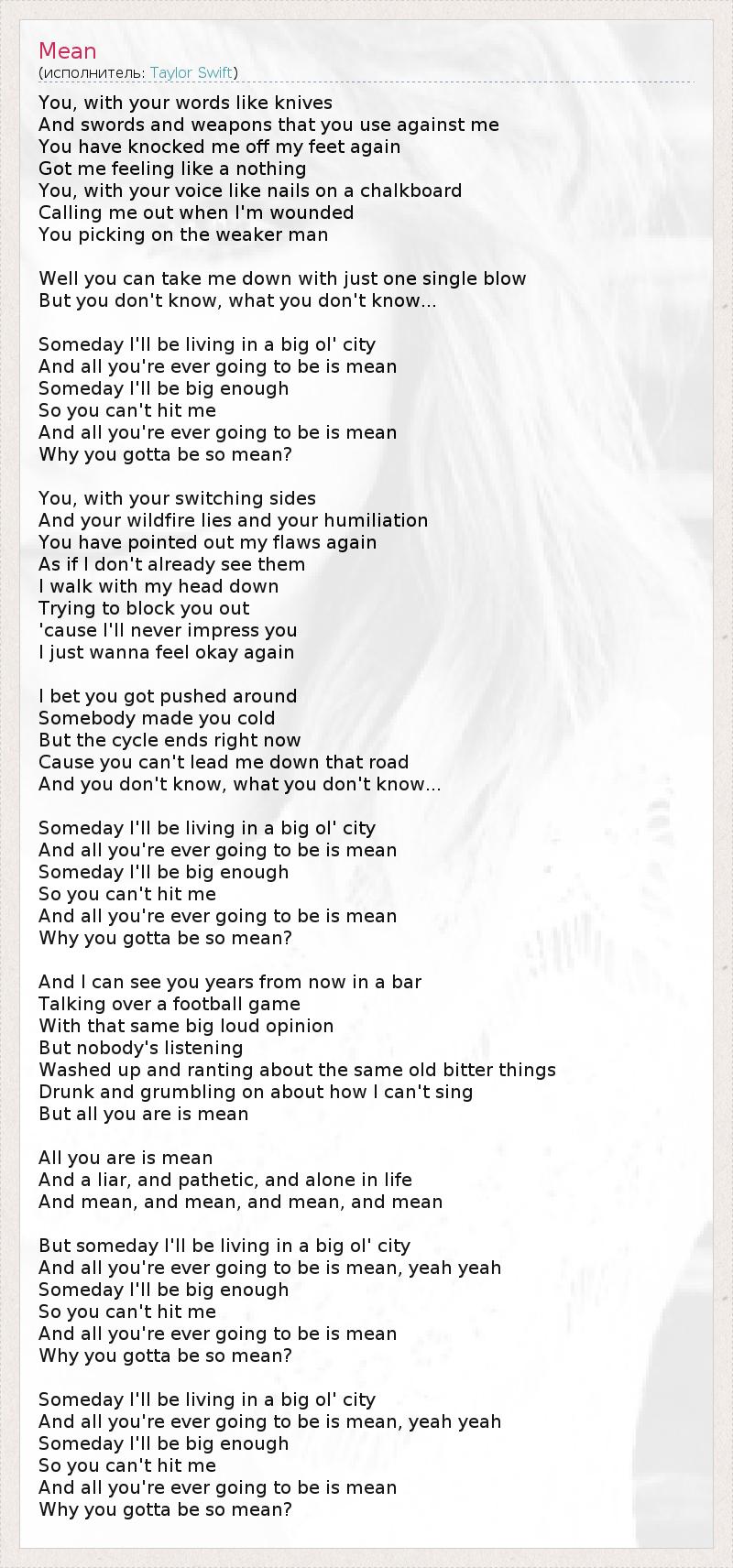 You, with your words like knives And swords and weapons that you use against me You have knocked me off my feet again Got me feeling like a nothing You, with your voice like nails on a chalkboard Calling me out when I'm wounded You picking on the weaker man Well you can take me down with just one single blow But you don't know, what you don't know... Someday I'll be living in a big ol' city And all you're ever going to be is mean Someday I'll be big enough So you can't hit me And all you're ever going to be is mean Why you gotta be so mean? You, with your switching sides And your wildfire lies and your humiliation You have pointed out my flaws again As if I don't already see them I walk with my head down Trying to block you out 'cause I'll never impress you I just wanna feel okay again I bet you got pushed around Somebody made you cold But the cycle ends right now Cause you can't lead me down that road And you don't know, what you don't know... Someday I'll be living in a big ol' city And all you're ever going to be is mean Someday I'll be big enough So you can't hit me And all you're ever going to be is mean Why you gotta be so mean? And I can see you years from now in a bar Talking over a football game With that same big loud opinion But nobody's listening Washed up and ranting about the same old bitter things Drunk and grumbling on about how I can't sing But all you are is mean All you are is mean And a liar, and pathetic, and alone in life And mean, and mean, and mean, and mean But someday I'll be living in a big ol' city And all you're ever going to be is mean, yeah yeah Someday I'll be big enough So you can't hit me And all you're ever going to be is mean Why you gotta be so mean? Someday I'll be living in a big ol' city And all you're ever going to be is mean, yeah yeah Someday I'll be big enough So you can't hit me And all you're ever going to be is mean Why you gotta be so mean?