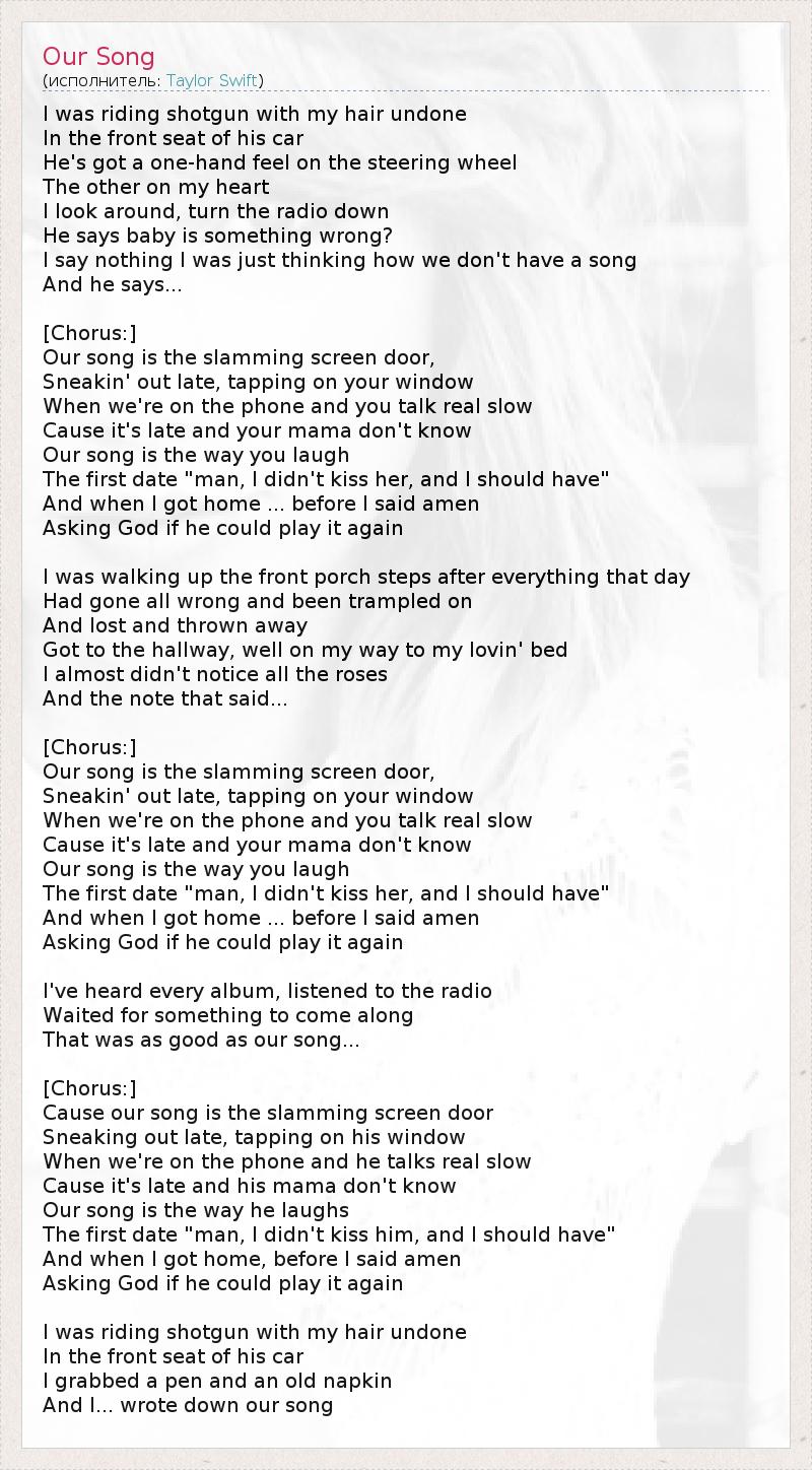 Я ответила: «Ничего. Я просто подумала, почему у нас нет песни...»