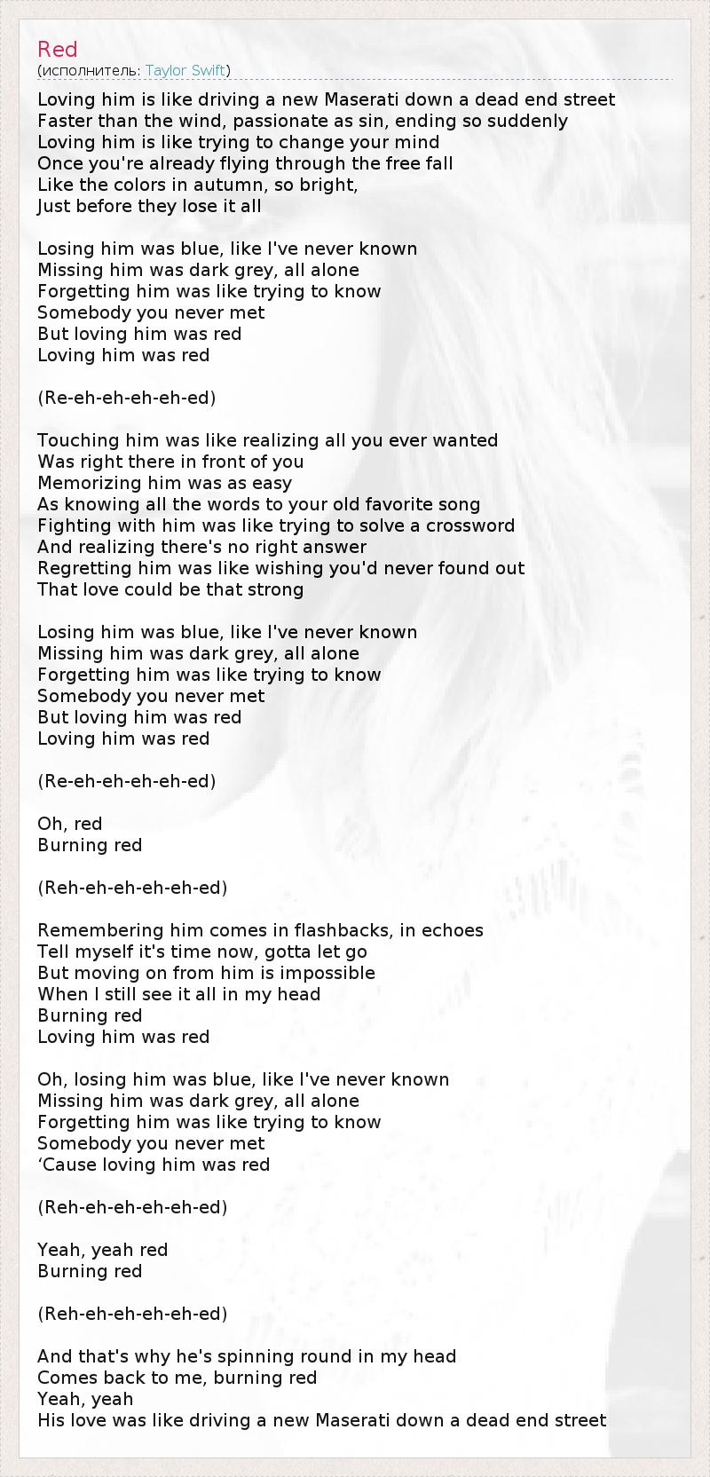 Red (рус. красный) — четвёртый альбом американской кантри-певицы Тейлор Свифт, изданный 22 октября 2012 года под звукозаписывающим лейблом Big Machine. Название и обложка альбома были официально представлены певицей 13 августа 2012 года в день премьеры первого сингла с этого диска — «We Are Never Ever Getting Back Together»]. Альбом включает в себя 16 треков (без бонус-материалов), в том числе дуэт, записанный с британским исполнителем Эдом Шираном.