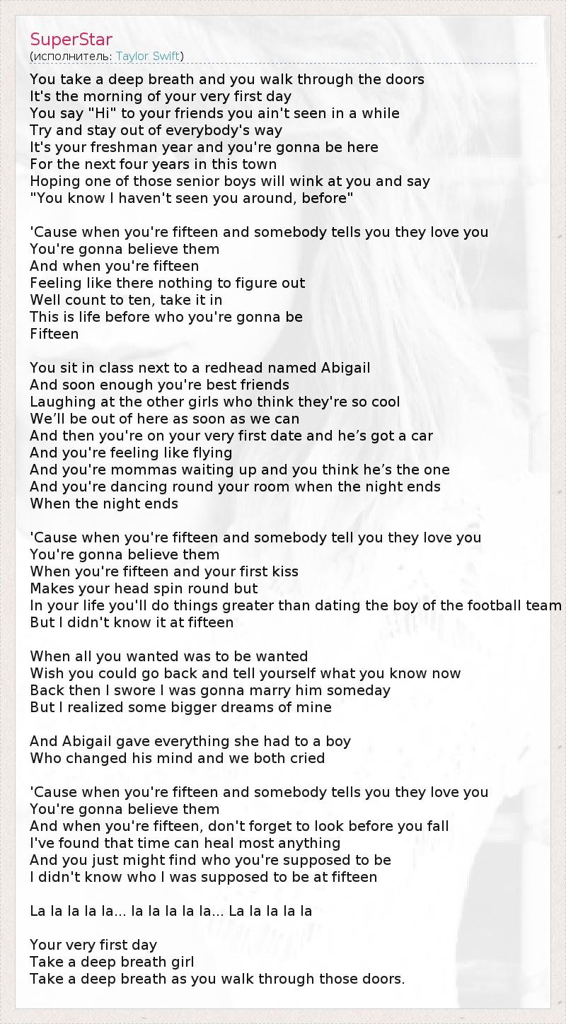 Это интересно:Тейлор Свифт родилась 13 декабря 1989 г. в городе Вайомиссинг, штат Пенсильвания, США. На Тейлор большое влияние оказали ее бабушка, которая была оперной певицей, и исполнительница Лиэнн Раймс. В 10 лет Тейлор уже стала местной знаменитостью в своем родном городе Вайомиссинге, выступая на ярмарках, фестивалях и состязаниях по караоке. Она спела государственный гимн на открытии 76-х Филадельфийских... продолжение