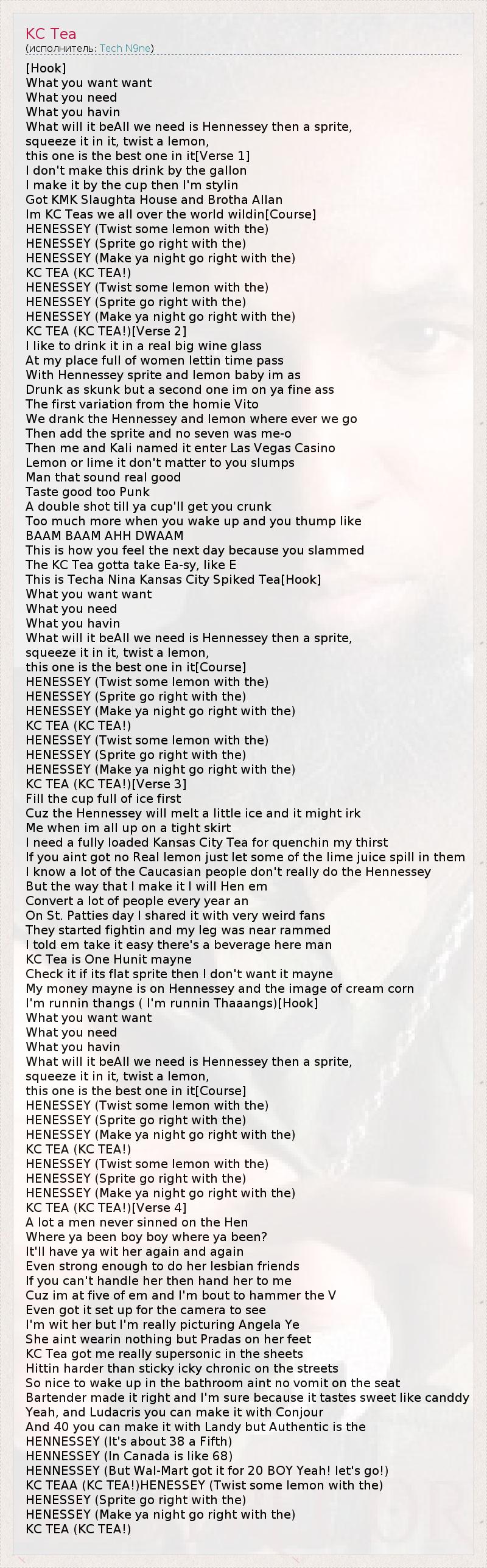 [Hook] What you want want What you need What you havin What will it beAll we need is Hennessey then a sprite, squeeze it in it, twist a lemon, this one is the best one in it[Verse 1] I don't make this drink by the gallon I make it by the cup then I'm stylin Got KMK Slaughta House and Brotha Allan Im KC Teas we all over the world wildin[Course] HENESSEY (Twist some lemon with the) HENESSEY (Sprite go right with the) HENESSEY (Make ya night go right with the) KC TEA (KC TEA!) HENESSEY (Twist some lemon with the) HENESSEY (Sprite go right with the) HENESSEY (Make ya night go right with the) KC TEA (KC TEA!)[Verse 2] I like to drink it in a real big wine glass At my place full of women lettin time pass With Hennessey sprite and lemon baby im as Drunk as skunk but a second one im on ya fine ass The first variation from the homie Vito We drank the Hennessey and lemon where ever we go Then add the sprite and no seven was me-o Then me and Kali named it enter Las Vegas Casino Lemon or lime it don't matter to you slumps Man that sound real good Taste good too Punk A double shot till ya cup'll get you crunk Too much more when you wake up and you thump like BAAM BAAM AHH DWAAM This is how you feel the next day because you slammed The KC Tea gotta take Ea-sy, like E This is Techa Nina Kansas City Spiked Tea[Hook] What you want want What you need What you havin What will it beAll we need is Hennessey then a sprite, squeeze it in it, twist a lemon, this one is the best one in it[Course] HENESSEY (Twist some lemon with the) HENESSEY (Sprite go right with the) HENESSEY (Make ya night go right with the) KC TEA (KC TEA!) HENESSEY (Twist some lemon with the) HENESSEY (Sprite go right with the) HENESSEY (Make ya night go right with the) KC TEA (KC TEA!)[Verse 3] Fill the cup full of ice first Cuz the Hennessey will melt a little ice and it might irk Me when im all up on a tight skirt I need a fully loaded Kansas City Tea for quenchin my thirst If you aint got no Real lemon just let some of the lime juice spill in them I know a lot of the Caucasian people don't really do the Hennessey But the way that I make it I will Hen em Convert a lot of people every year an On St. Patties day I shared it with very weird fans They started fightin and my leg was near rammed I told em take it easy there's a beverage here man KC Tea is One Hunit mayne Check it if its flat sprite then I don't want it mayne My money mayne is on Hennessey and the image of cream corn I'm runnin thangs ( I'm runnin Thaaangs)[Hook] What you want want What you need What you havin What will it beAll we need is Hennessey then a sprite, squeeze it in it, twist a lemon, this one is the best one in it[Course] HENESSEY (Twist some lemon with the) HENESSEY (Sprite go right with the) HENESSEY (Make ya night go right with the) KC TEA (KC TEA!) HENESSEY (Twist some lemon with the) HENESSEY (Sprite go right with the) HENESSEY (Make ya night go right with the) KC TEA (KC TEA!)[Verse 4] A lot a men never sinned on the Hen Where ya been boy boy where ya been? It'll have ya wit her again and again Even strong enough to do her lesbian friends If you can't handle her then hand her to me Cuz im at five of em and I'm bout to hammer the V Even got it set up for the camera to see I'm wit her but I'm really picturing Angela Ye She aint wearin nothing but Pradas on her feet KC Tea got me really supersonic in the sheets Hittin harder than sticky icky chronic on the streets So nice to wake up in the bathroom aint no vomit on the seat Bartender made it right and I'm sure because it tastes sweet like canddy Yeah, and Ludacris you can make it with Conjour And 40 you can make it with Landy but Authentic is the HENNESSEY (It's about 38 a Fifth) HENNESSEY (In Canada is like 68) HENNESSEY (But Wal-Mart got it for 20 BOY Yeah! let's go!) KC TEAA (KC TEA!)HENESSEY (Twist some lemon with the) HENESSEY (Sprite go right with the) HENESSEY (Make ya night go right with the) KC TEA (KC TEA!)