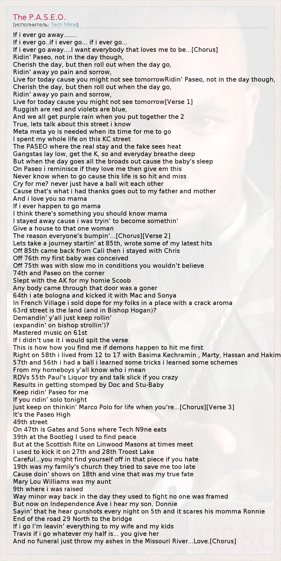 If i ever go away....... If i ever go..if i ever go... if i ever go... If i ever go away....I want everybody that loves me to be...[Chorus] Ridin' Paseo, not in the day though, Cherish the day, but then roll out when the day go, Ridin' away yo pain and sorrow, Live for today cause you might not see tomorrowRidin' Paseo, not in the day though, Cherish the day, but then roll out when the day go, Ridin' away yo pain and sorrow, Live for today cause you might not see tomorrow[Verse 1] Ruggish are red and violets are blue, And we all get purple rain when you put together the 2 True, lets talk about this street i know Meta meta yo is needed when its time for me to go I spent my whole life on this KC street The PASEO where the real stay and the fake sees heat Gangstas lay low, get the K, so and everyday breathe deep But when the day goes all the broads out cause the baby's sleep On Paseo i reminisce if they love me then give em this Never know when to go cause this life is so hit and miss Cry for me? never just have a ball wit each other Cause that's what i had thanks goes out to my father and mother And i love you so mama If i ever happen to go mama I think there's something you should know mama I stayed away cause i was tryin' to become somethin' Give a house to that one woman The reason everyone's bumpin'...[Chorus][Verse 2] Lets take a journey startin' at 85th, wrote some of my latest hits Off 85th came back from Cali then i stayed with Chris Off 76th my first baby was conceived Off 75th was with slow mo in conditions you wouldn't believe 74th and Paseo on the corner Slept with the AK for my homie Scoob Any body came through that door was a goner 64th i ate bologna and kicked it with Mac and Sonya In French Village i sold dope for my folks in a place with a crack aroma 63rd street is the land (and in Bishop Hogan)? Demandin' y'all just keep rollin' (expandin' on bishop strollin')? Mastered music on 61st If i didn't use it i would spit the verse This is how how you find me if demons happen to hit me first Right on 58th i lived from 12 to 17 with Basima Kechramin , Marty, Hassan and Hakim 57th and 56th i had a ball i learned some tricks i learned some schemes From my homeboys y'all know who i mean RDVs 55th Paul's Liquor try and talk slick if you crazy Results in getting stomped by Doc and Stu-Baby Keep ridin' Paseo for me If you ridin' solo tonight Just keep on thinkin' Marco Polo for life when you're...[Chorus][Verse 3] It's the Paseo High 49th street On 47th is Gates and Sons where Tech N9ne eats 39th at the Bootleg I used to find peace But at the Scottish Rite on Linwood Masons at times meet I used to kick it on 27th and 28th Troost Lake Careful...you might find yourself off in that piece if you hate 19th was my family's church they tried to save me too late Cause doin' shows on 18th and vine that was my true fate Mary Lou Williams was my aunt 9th where i was raised Way minor way back in the day they used to fight no one was framed But now on Independence Ave i hear my son, Donnie Sayin' that he hear gunshots every night on 5th and it scares his momma Ronnie End of the road 29 North to the bridge If i go I'm leavin' everything to my wife and my kids Travis if i go whatever my half is... you give her And no funeral just throw my ashes in the Missouri River...Love.[Chorus]