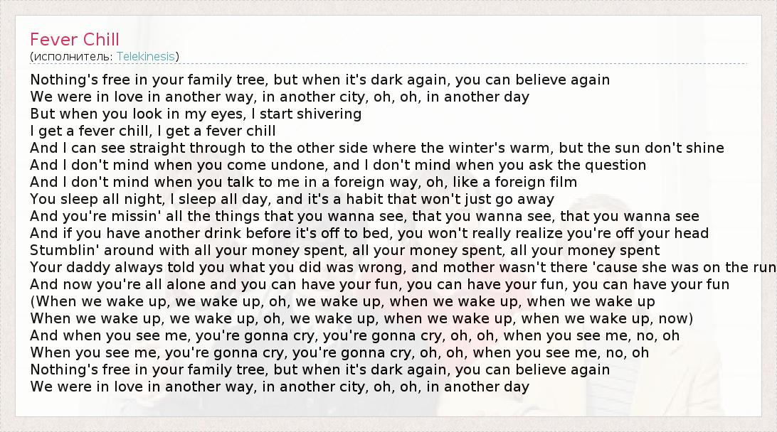 А как ты думаешь, о чем песня "Fever Chill" ?