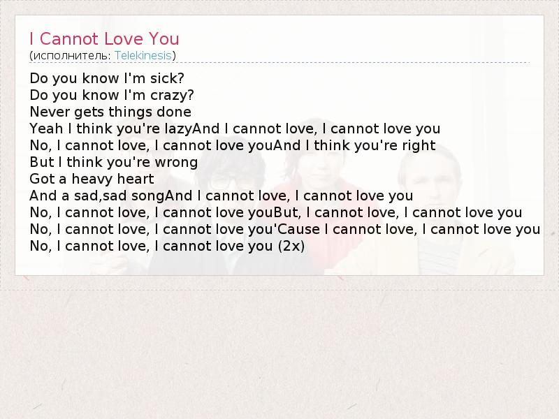 Do you know I'm sick? Do you know I'm crazy? Never gets things done Yeah I think you're lazyAnd I cannot love, I cannot love you No, I cannot love, I cannot love youAnd I think you're right But I think you're wrong Got a heavy heart And a sad,sad songAnd I cannot love, I cannot love you No, I cannot love, I cannot love youBut, I cannot love, I cannot love you No, I cannot love, I cannot love you'Cause I cannot love, I cannot love you No, I cannot love, I cannot love you (2x)