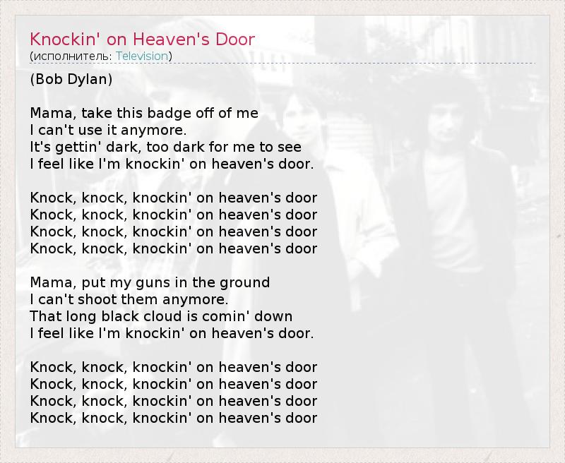 (Bob Dylan) Mama, take this badge off of me I can't use it anymore. It's gettin' dark, too dark for me to see I feel like I'm knockin' on heaven's door. Knock, knock, knockin' on heaven's door Knock, knock, knockin' on heaven's door Knock, knock, knockin' on heaven's door Knock, knock, knockin' on heaven's door Mama, put my guns in the ground I can't shoot them anymore. That long black cloud is comin' down I feel like I'm knockin' on heaven's door. Knock, knock, knockin' on heaven's door Knock, knock, knockin' on heaven's door Knock, knock, knockin' on heaven's door Knock, knock, knockin' on heaven's door