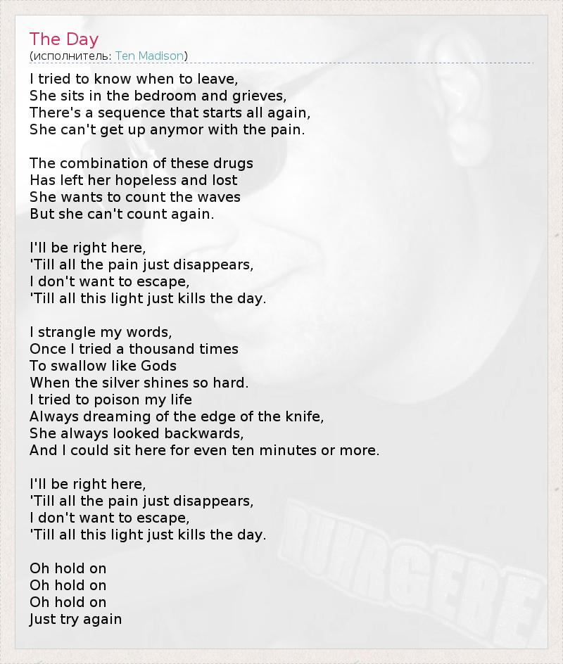 Я пытался узнать, когда уйти, Она сидит в спальне и скорбит. Здесь есть последовательность, повторяющаяся снова и снова, Она больше не может встать с этой болью. Сочетание этих лекарств Сделало ее потерянной и не оставило надежды, Она хочет считать волны, Но она больше не может считать. Я буду здесь, Пока вся боль не пройдет, Я не хочу бежать, Пока этот свет не убьет день... Слова застревают в горле, Когда-то я пробовал тысячу раз Глотать, как боги, Когда серебро светит так ослепительно. Я пытался отравить свою жизнь, Всегда мечтая о лезвии ножа, Она всегда оглядывалась назад, И я мог бы сидеть здесь еще десять минут или больше. Я буду здесь, Пока вся боль не пройдет, Я не хочу бежать, Пока этот свет не убьет день... О, держись, О, держись, О, держись, Просто попробуй еще раз.