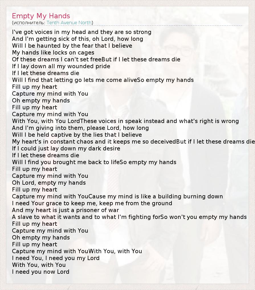 I've got voices in my head and they are so strong And I'm getting sick of this, oh Lord, how long Will I be haunted by the fear that I believe My hands like locks on cages Of these dreams I can't set freeBut if I let these dreams die If I lay down all my wounded pride If I let these dreams die Will I find that letting go lets me come aliveSo empty my hands Fill up my heart Capture my mind with You Oh empty my hands Fill up my heart Capture my mind with You With You, with You LordThese voices in speak instead and what's right is wrong And I'm giving into them, please Lord, how long Will I be held captive by the lies that I believe My heart's in constant chaos and it keeps me so deceivedBut if I let these dreams die If I could just lay down my dark desire If I let these dreams die Will I find you brought me back to lifeSo empty my hands Fill up my heart Capture my mind with You Oh Lord, empty my hands Fill up my heart Capture my mind with YouCause my mind is like a building burning down I need Your grace to keep me, keep me from the ground And my heart is just a prisoner of war A slave to what it wants and to what I'm fighting forSo won't you empty my hands Fill up my heart Capture my mind with You Oh empty my hands Fill up my heart Capture my mind with YouWith You, with You I need You, I need you my Lord With You, with You I need you now Lord
