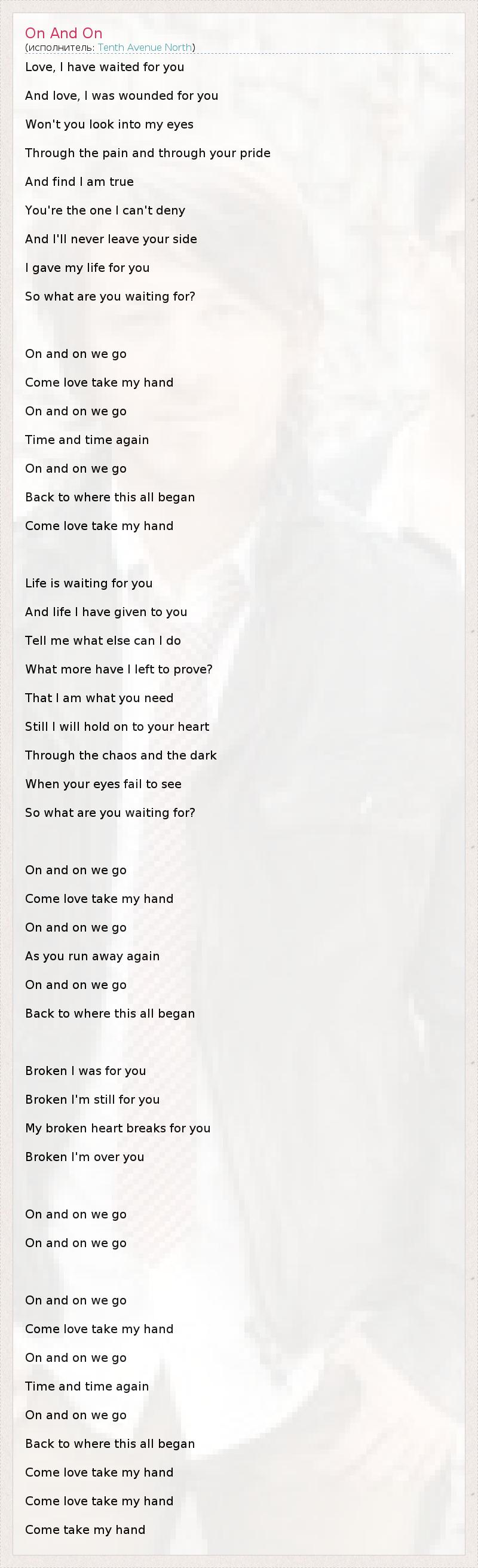 Это интересно:Tenth Avenue North - Американская Современная Христианская рок-группа из West Palm Beach, Florida. Майк Данхэй – вокал и акустическая гитара, Джефф Оуэн - электрогитара и бек вокал, Джейсон Джеймисон - барабаны, и Скотт Сандерс – бас гитара.Их дебютный альбом «Over and Underneath» был выпущен 20 мая, 2008, на студии Reunion Records, и группа начала турне по его продвижению. Их песня "Love is Here" была на вершине двадцатки... продолжение