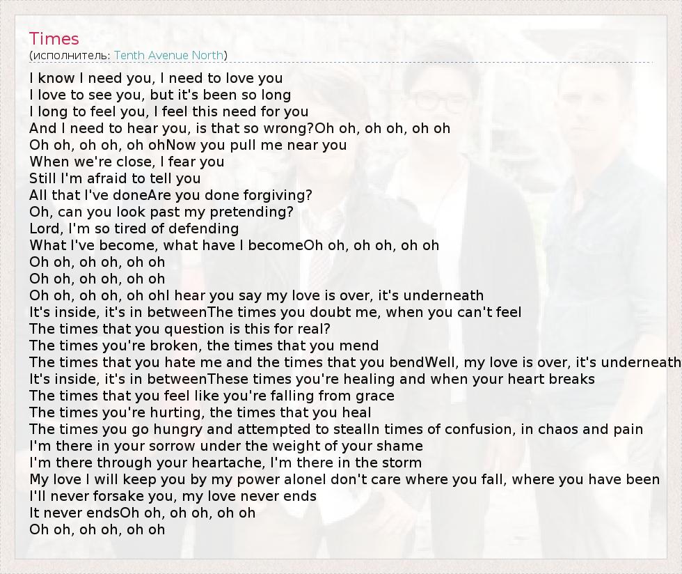 Это интересно:Tenth Avenue North - Американская Современная Христианская рок-группа из West Palm Beach, Florida. Майк Данхэй – вокал и акустическая гитара, Джефф Оуэн - электрогитара и бек вокал, Джейсон Джеймисон - барабаны, и Скотт Сандерс – бас гитара.Их дебютный альбом «Over and Underneath» был выпущен 20 мая, 2008, на студии Reunion Records, и группа начала турне по его продвижению. Их песня "Love is Here" была на вершине двадцатки... продолжение
