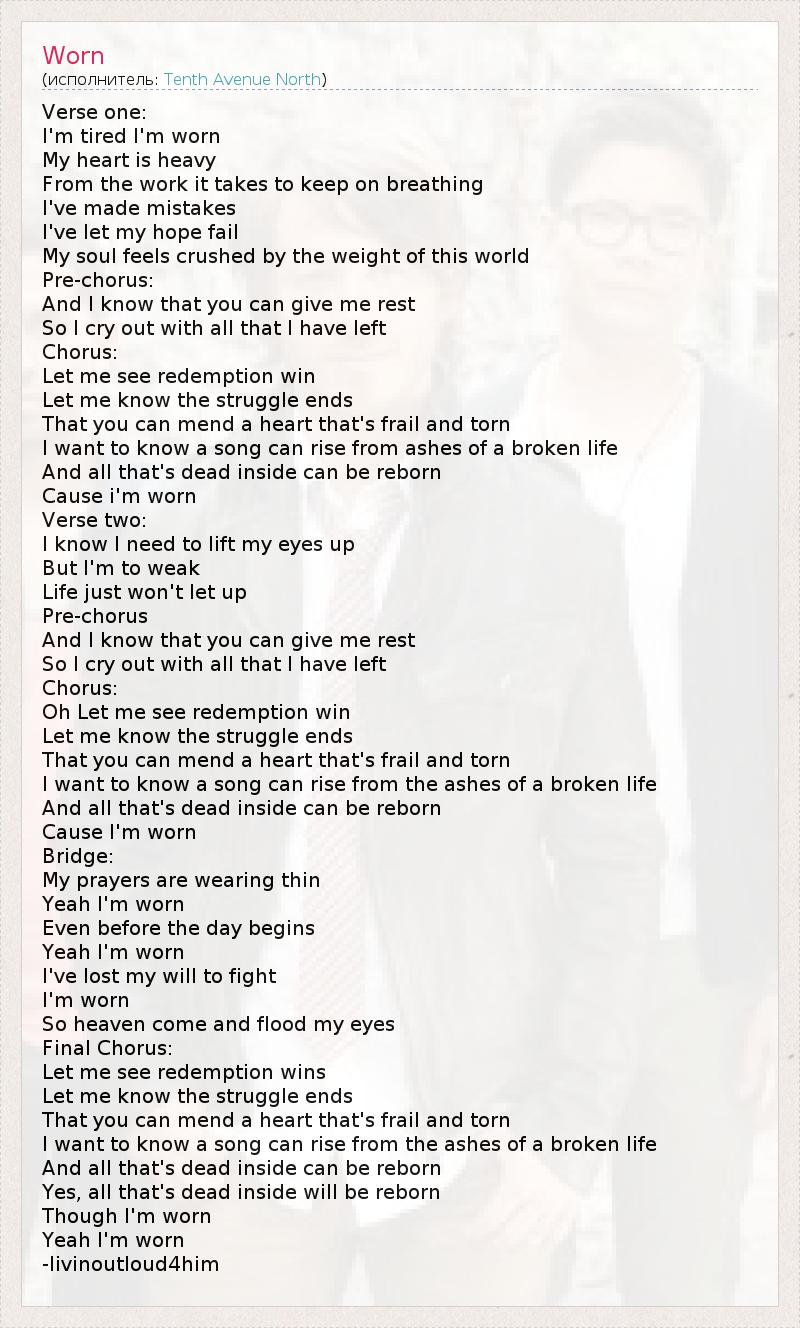 Это интересно:Tenth Avenue North - Американская Современная Христианская рок-группа из West Palm Beach, Florida. Майк Данхэй – вокал и акустическая гитара, Джефф Оуэн - электрогитара и бек вокал, Джейсон Джеймисон - барабаны, и Скотт Сандерс – бас гитара.Их дебютный альбом «Over and Underneath» был выпущен 20 мая, 2008, на студии Reunion Records, и группа начала турне по его продвижению. Их песня "Love is Here" была на вершине двадцатки... продолжение