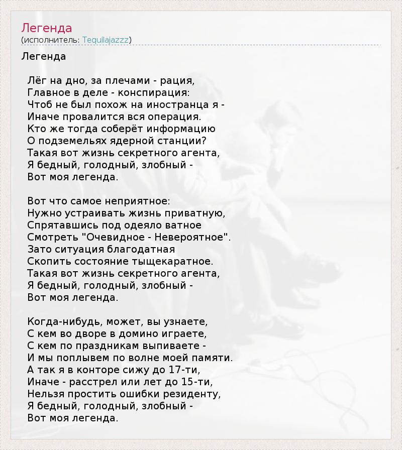 Легенда Лёг на дно, за плечами - рация, Главное в деле - конспирация: Чтоб не был похож на иностранца я - Иначе провалится вся операция. Кто же тогда соберёт информацию О подземельях ядерной станции? Такая вот жизнь секретного агента, Я бедный, голодный, злобный - Вот моя легенда. Вот что самое неприятное: Нужно устраивать жизнь приватную, Спрятавшись под одеяло ватное Смотреть "Очевидное - Невероятное". Зато ситуация благодатная Скопить состояние тыщекаратное. Такая вот жизнь секретного агента, Я бедный, голодный, злобный - Вот моя легенда. Когда-нибудь, может, вы узнаете, С кем во дворе в домино играете, С кем по праздникам выпиваете - И мы поплывем по волне моей памяти. А так я в конторе сижу до 17-ти, Иначе - расстрел или лет до 15-ти, Нельзя простить ошибки резиденту, Я бедный, голодный, злобный - Вот моя легенда.