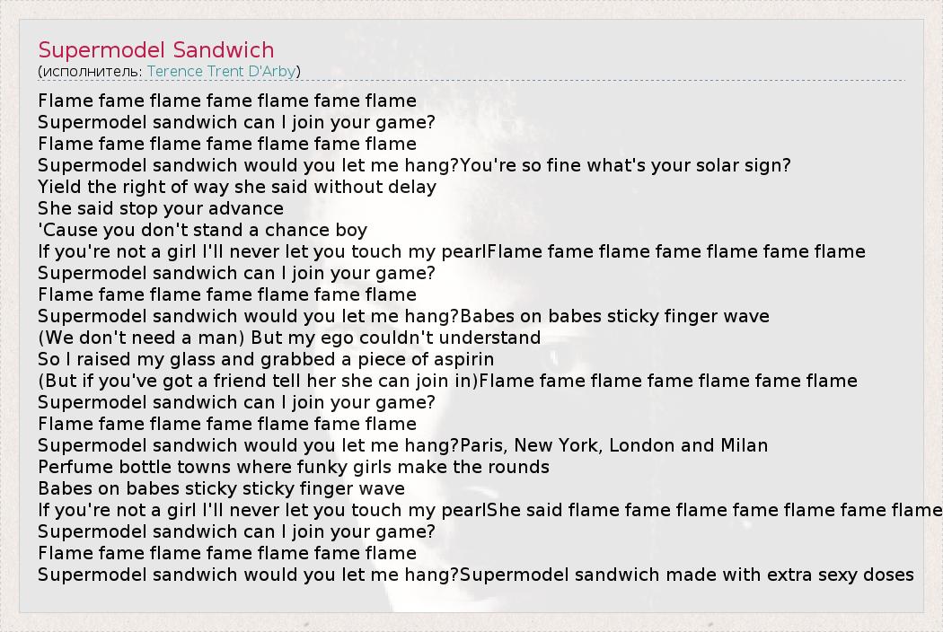 Flame fame flame fame flame fame flame Supermodel sandwich can I join your game? Flame fame flame fame flame fame flame Supermodel sandwich would you let me hang?You're so fine what's your solar sign? Yield the right of way she said without delay She said stop your advance 'Cause you don't stand a chance boy If you're not a girl I'll never let you touch my pearlFlame fame flame fame flame fame flame Supermodel sandwich can I join your game? Flame fame flame fame flame fame flame Supermodel sandwich would you let me hang?Babes on babes sticky finger wave (We don't need a man) But my ego couldn't understand So I raised my glass and grabbed a piece of aspirin (But if you've got a friend tell her she can join in)Flame fame flame fame flame fame flame Supermodel sandwich can I join your game? Flame fame flame fame flame fame flame Supermodel sandwich would you let me hang?Paris, New York, London and Milan Perfume bottle towns where funky girls make the rounds Babes on babes sticky sticky finger wave If you're not a girl I'll never let you touch my pearlShe said flame fame flame fame flame fame flame Supermodel sandwich can I join your game? Flame fame flame fame flame fame flame Supermodel sandwich would you let me hang?Supermodel sandwich made with extra sexy doses