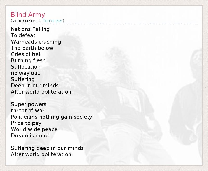 Это интересно:Terrorizer — американская грайндкор и дет-метал группа сформированная в 1986, в Лос-Анджелесе, Калифорния. Первоначальный состав включал в себя — Оскар Гарсиа (вокал, гитара), Джесси Пинтадо (ведущая гитара), Альфред «Garvey» Истрада (бас), Пит Сэндовал (ударные). После роспуска группы её участники получили признание, играя в таких влиятельных экстремально металлических группах как Morbid... продолжение