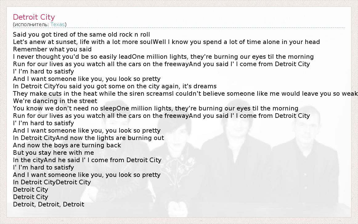 Run for our lives as you watch all the cars on the freewayAnd you said I' I come from Detroit City