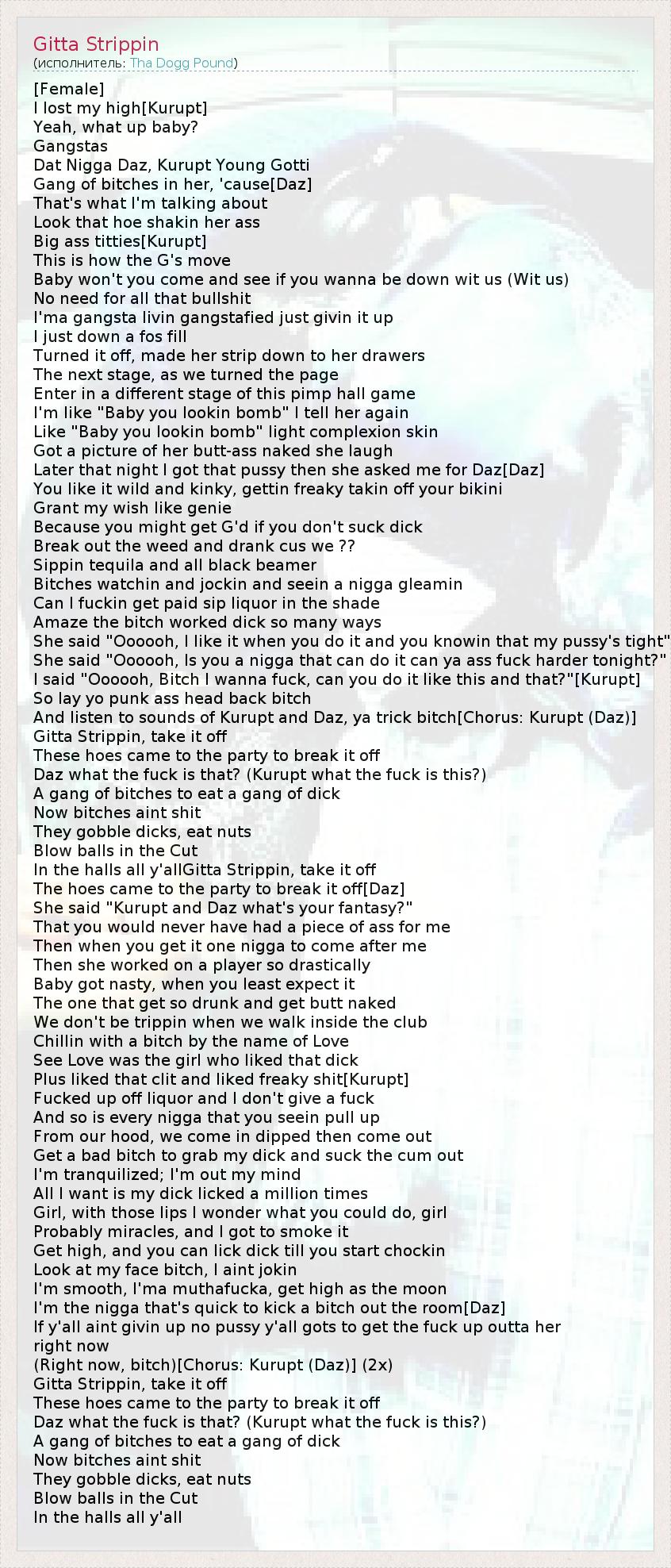 [Female] I lost my high[Kurupt] Yeah, what up baby? Gangstas Dat Nigga Daz, Kurupt Young Gotti Gang of bitches in her, 'cause[Daz] That's what I'm talking about Look that hoe shakin her ass Big ass titties[Kurupt] This is how the G's move Baby won't you come and see if you wanna be down wit us (Wit us) No need for all that bullshit I'ma gangsta livin gangstafied just givin it up I just down a fos fill Turned it off, made her strip down to her drawers The next stage, as we turned the page Enter in a different stage of this pimp hall game I'm like "Baby you lookin bomb" I tell her again Like "Baby you lookin bomb" light complexion skin Got a picture of her butt-ass naked she laugh Later that night I got that pussy then she asked me for Daz[Daz] You like it wild and kinky, gettin freaky takin off your bikini Grant my wish like genie Because you might get G'd if you don't suck dick Break out the weed and drank cus we ?? Sippin tequila and all black beamer Bitches watchin and jockin and seein a nigga gleamin Can I fuckin get paid sip liquor in the shade Amaze the bitch worked dick so many ways She said "Oooooh, I like it when you do it and you knowin that my pussy's tight" She said "Oooooh, Is you a nigga that can do it can ya ass fuck harder tonight?" I said "Oooooh, Bitch I wanna fuck, can you do it like this and that?"[Kurupt] So lay yo punk ass head back bitch And listen to sounds of Kurupt and Daz, ya trick bitch[Chorus: Kurupt (Daz)] Gitta Strippin, take it off These hoes came to the party to break it off Daz what the fuck is that? (Kurupt what the fuck is this?) A gang of bitches to eat a gang of dick Now bitches aint shit They gobble dicks, eat nuts Blow balls in the Cut In the halls all y'allGitta Strippin, take it off The hoes came to the party to break it off[Daz] She said "Kurupt and Daz what's your fantasy?" That you would never have had a piece of ass for me Then when you get it one nigga to come after me Then she worked on a player so drastically Baby got nasty, when you least expect it The one that get so drunk and get butt naked We don't be trippin when we walk inside the club Chillin with a bitch by the name of Love See Love was the girl who liked that dick Plus liked that clit and liked freaky shit[Kurupt] Fucked up off liquor and I don't give a fuck And so is every nigga that you seein pull up From our hood, we come in dipped then come out Get a bad bitch to grab my dick and suck the cum out I'm tranquilized; I'm out my mind All I want is my dick licked a million times Girl, with those lips I wonder what you could do, girl Probably miracles, and I got to smoke it Get high, and you can lick dick till you start chockin Look at my face bitch, I aint jokin I'm smooth, I'ma muthafucka, get high as the moon I'm the nigga that's quick to kick a bitch out the room[Daz] If y'all aint givin up no pussy y'all gots to get the fuck up outta her right now (Right now, bitch)[Chorus: Kurupt (Daz)] (2x) Gitta Strippin, take it off These hoes came to the party to break it off Daz what the fuck is that? (Kurupt what the fuck is this?) A gang of bitches to eat a gang of dick Now bitches aint shit They gobble dicks, eat nuts Blow balls in the Cut In the halls all y'all